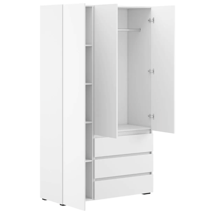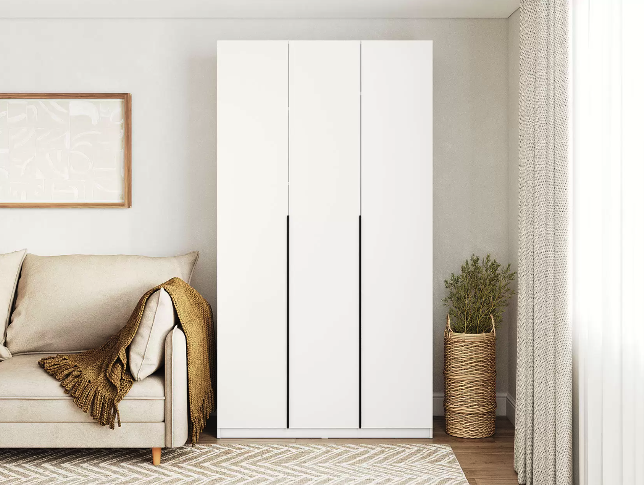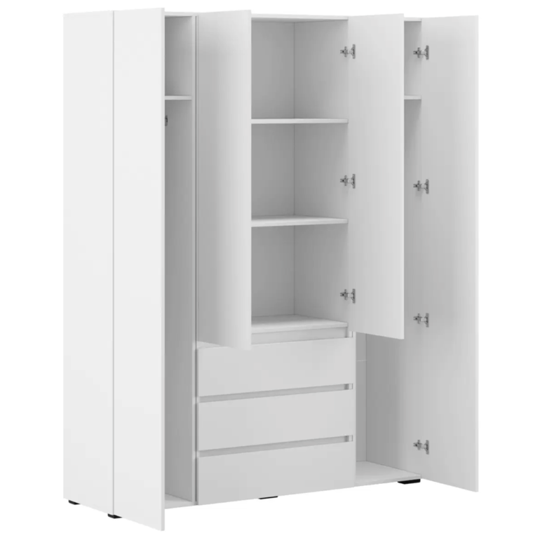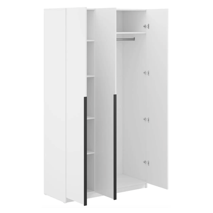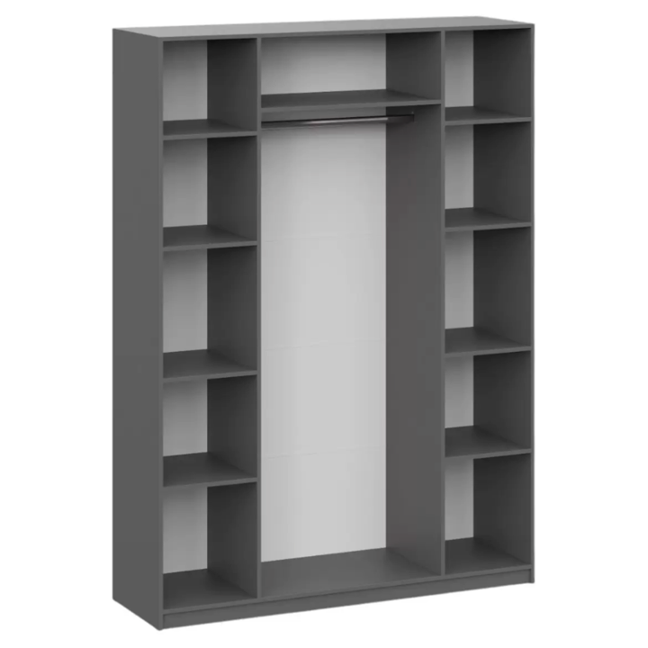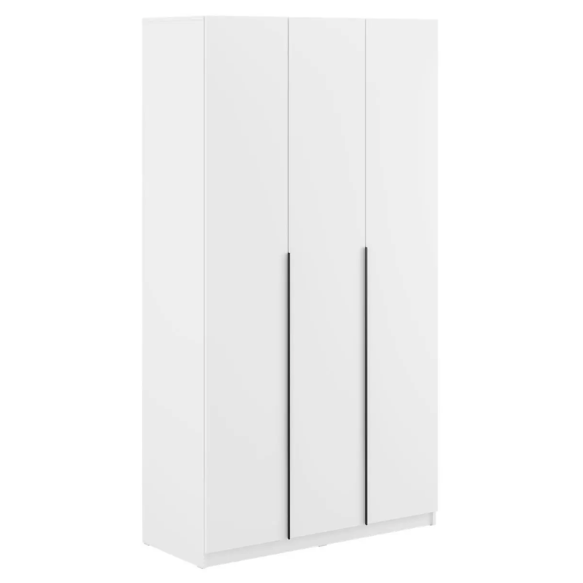Трёхдверный распашной шкаф — лаконичный и функциональный элемент интерьера. Оснащён штангой для вешалок и 5 вместительными полками. Корпус и фасад из ЛДСП, стальные накладные петли Boyard обеспечивают надёжность. Идеален для спальни, прихожей или гостиной