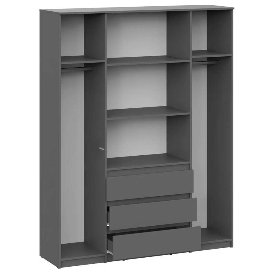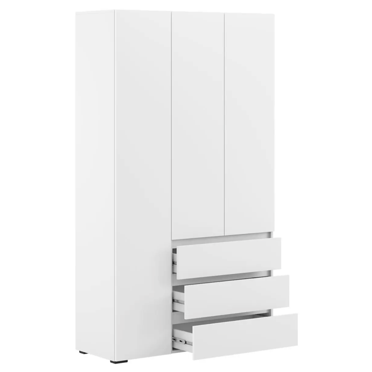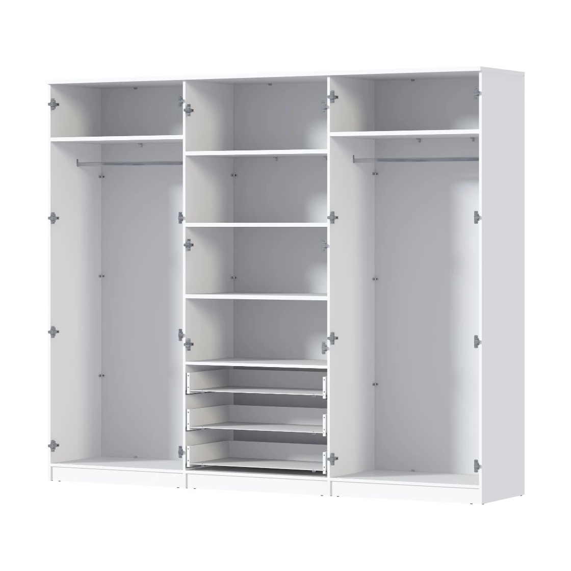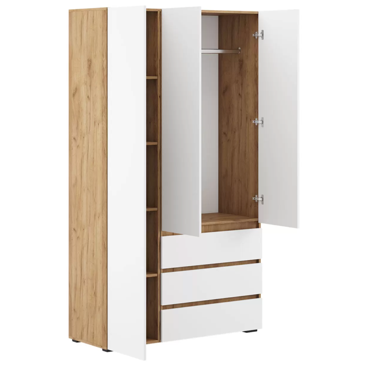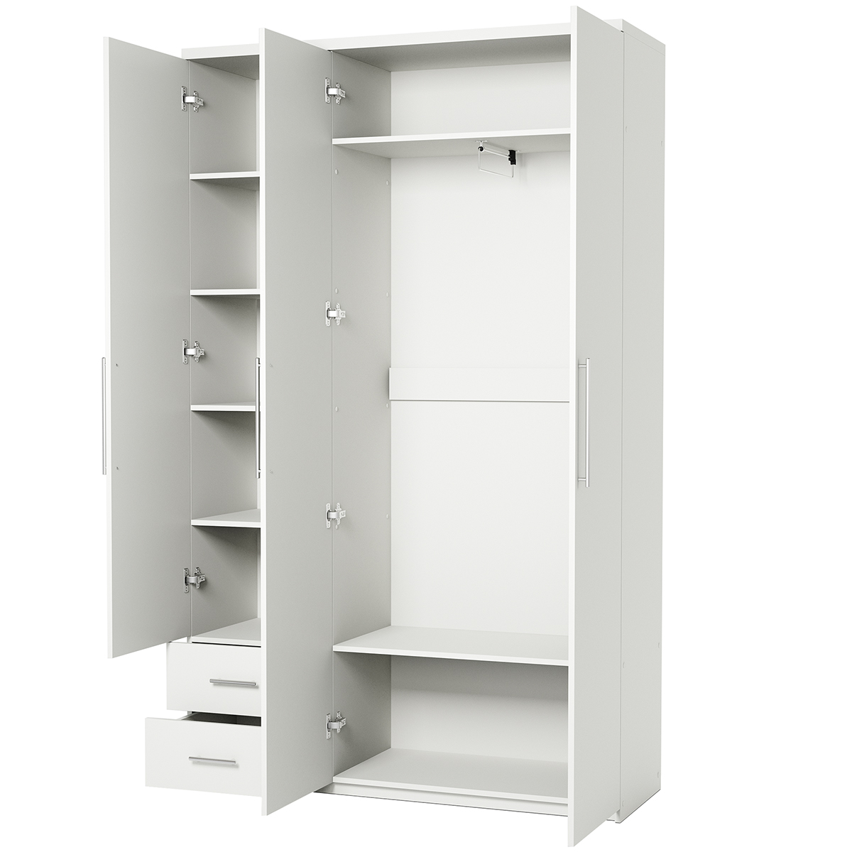 Трёхдверный распашной шкаф — лаконичный и функциональный элемент интерьера. Оснащён штангой для вешалок и 5 вместительными полками. Корпус и фасад из ЛДСП, стальные накладные петли Boyard обеспечивают надёжность. Идеален для спальни, прихожей или гостиной