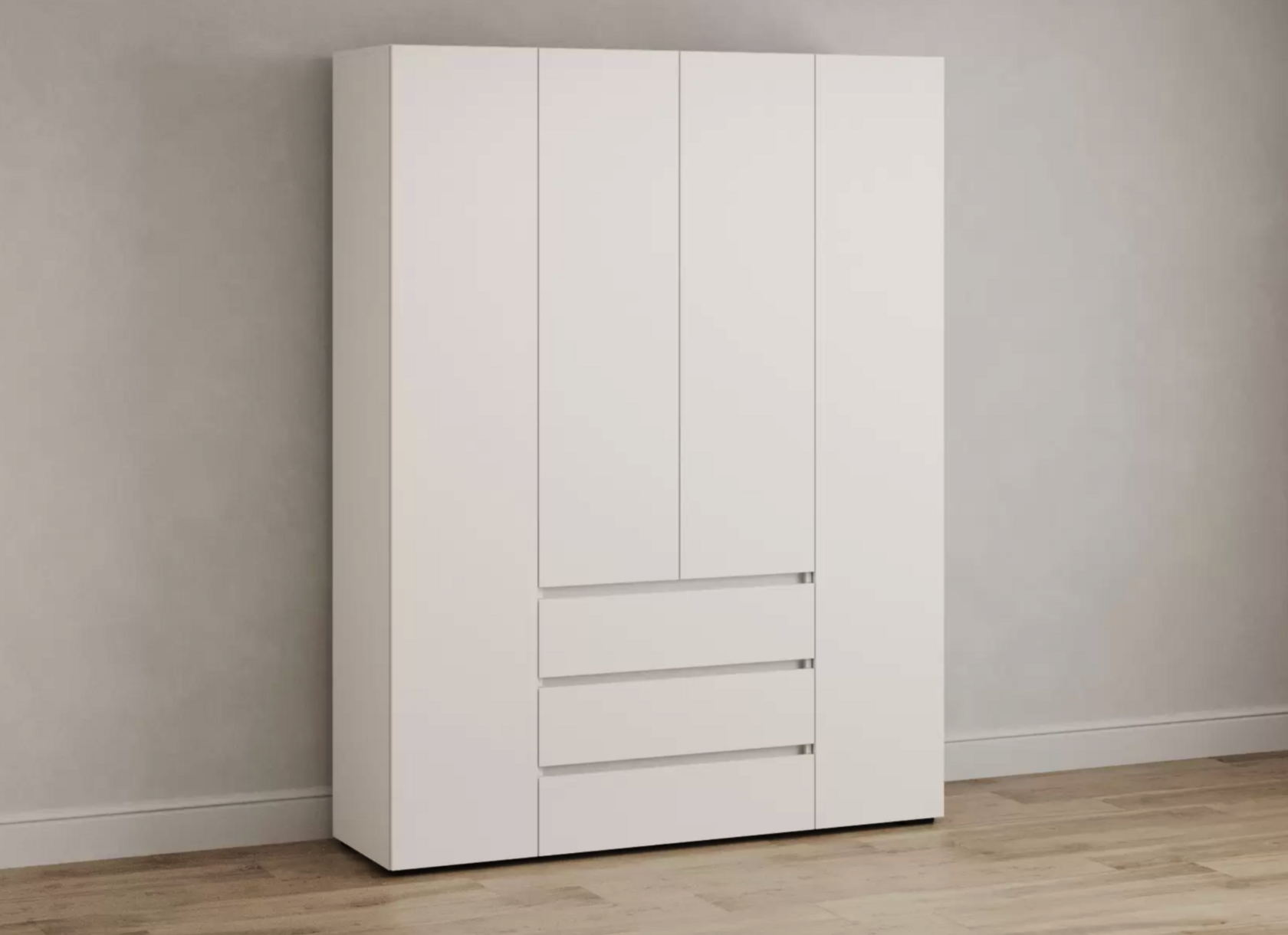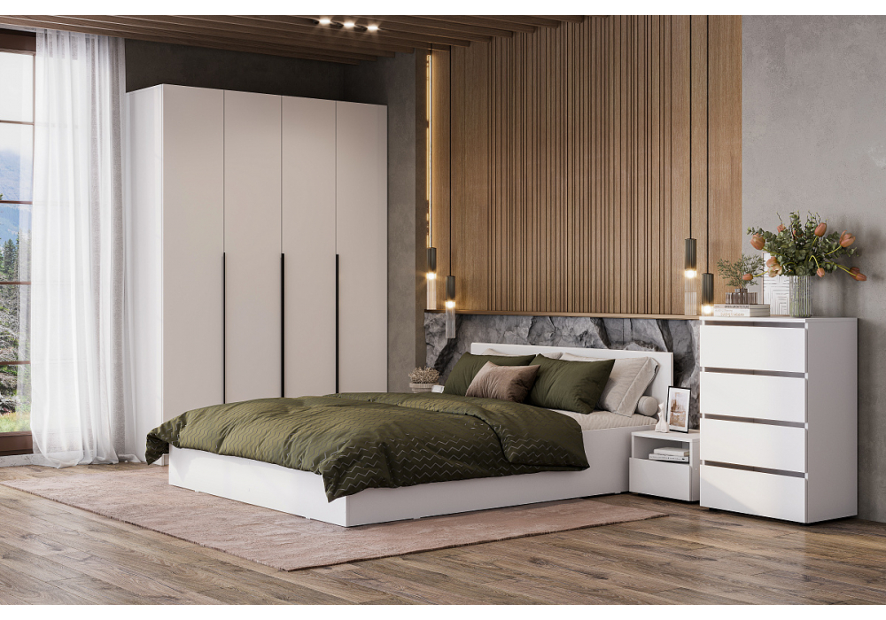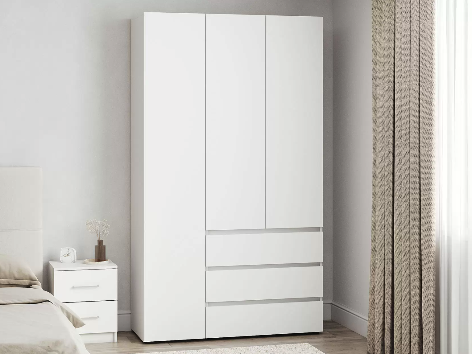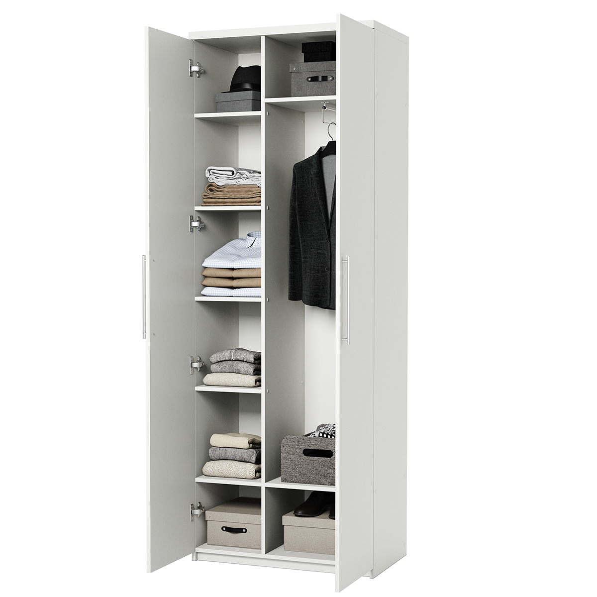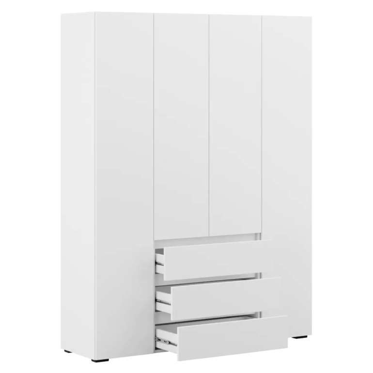 Распашной шкаф Bianca 2 — компактная модель, выполненная в эстетике минимализма. В комплектации с полками и ящиками шкаф подходит для хранения одежды в сложенном виде, белья и домашнего текстиля