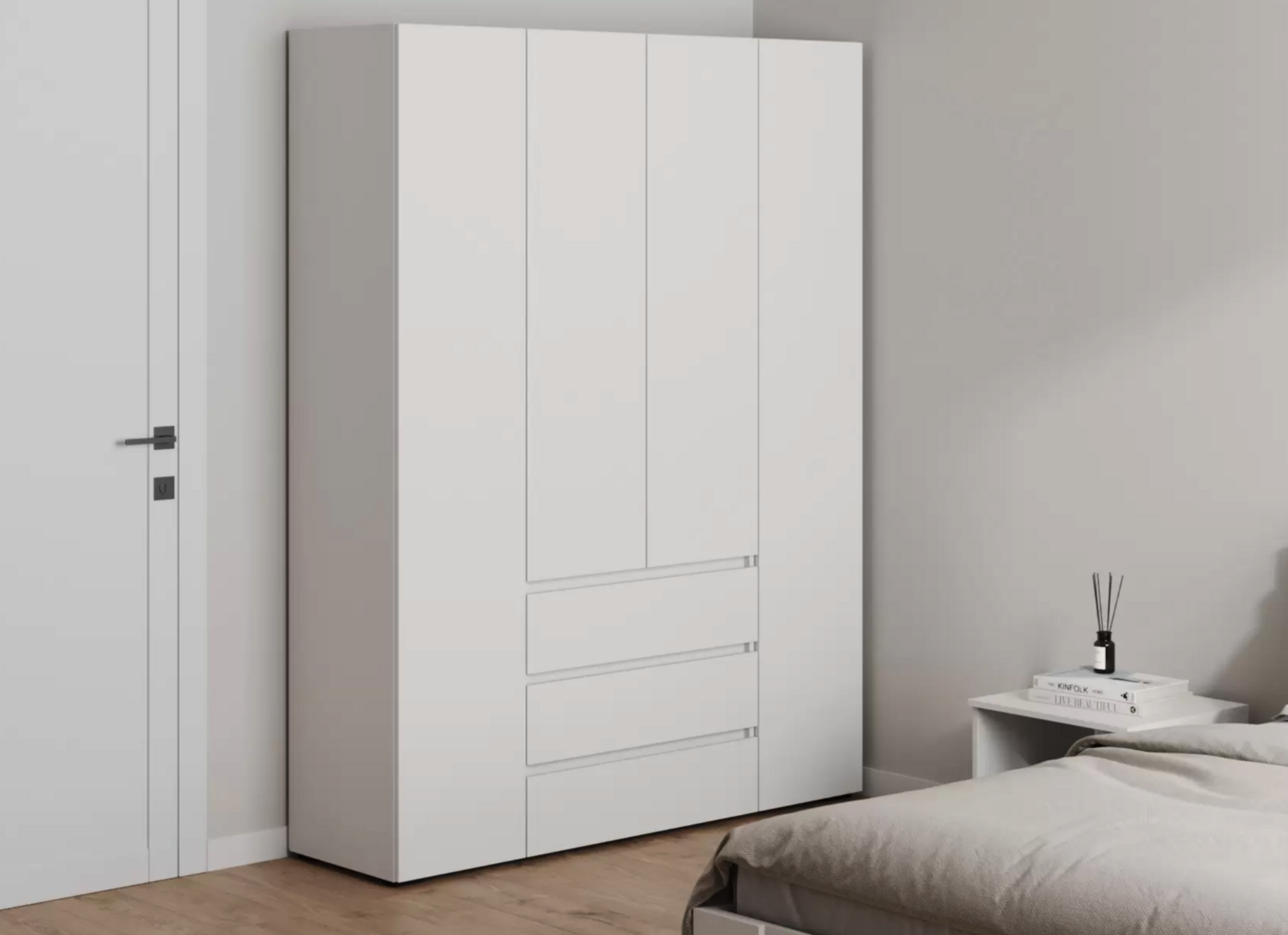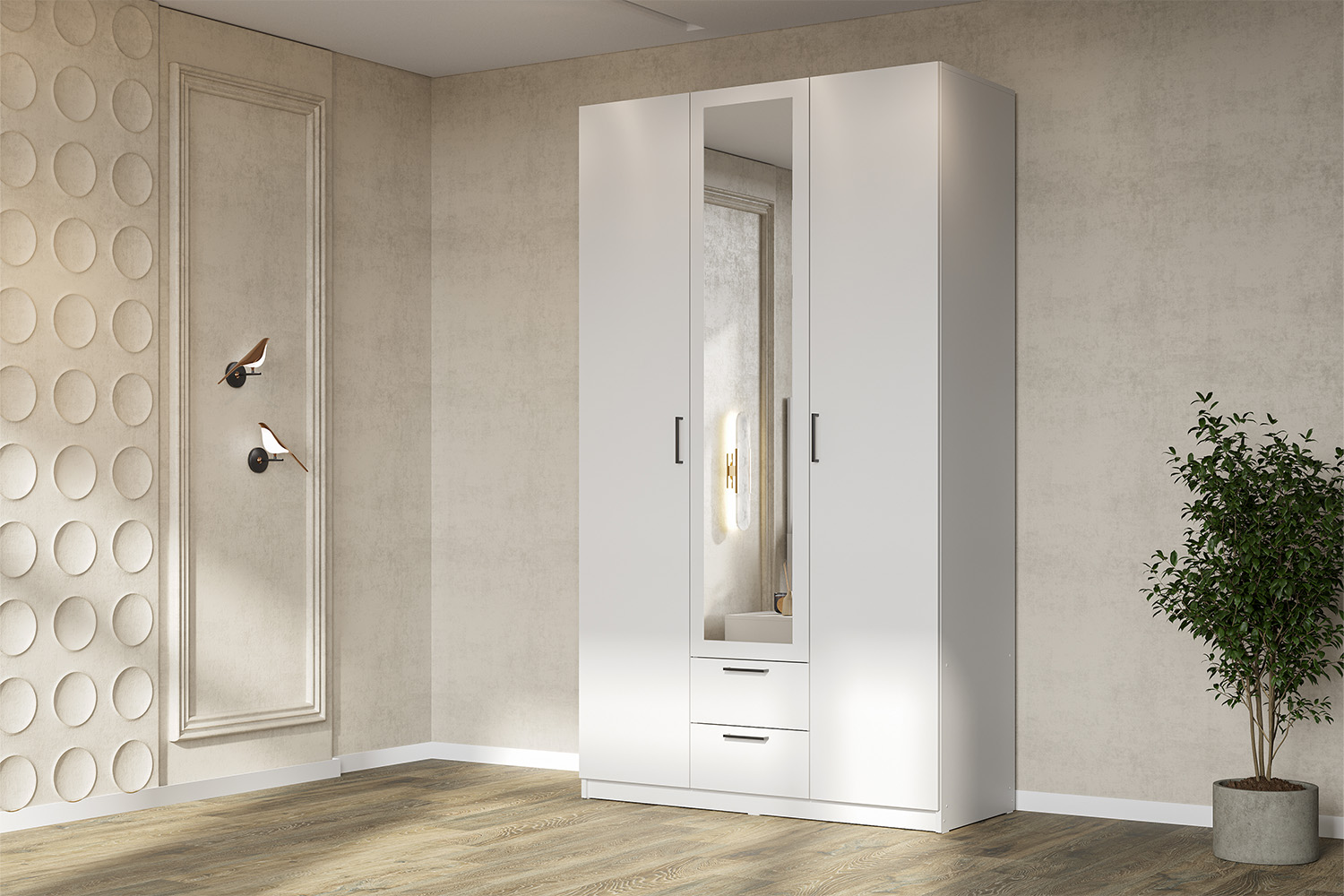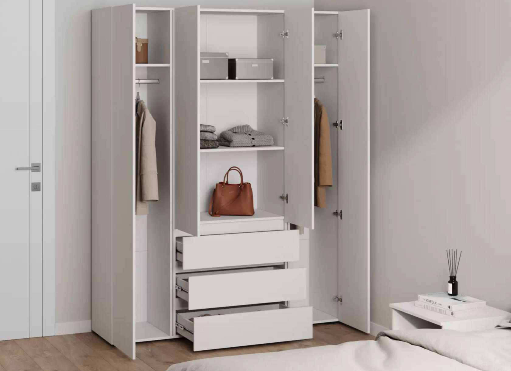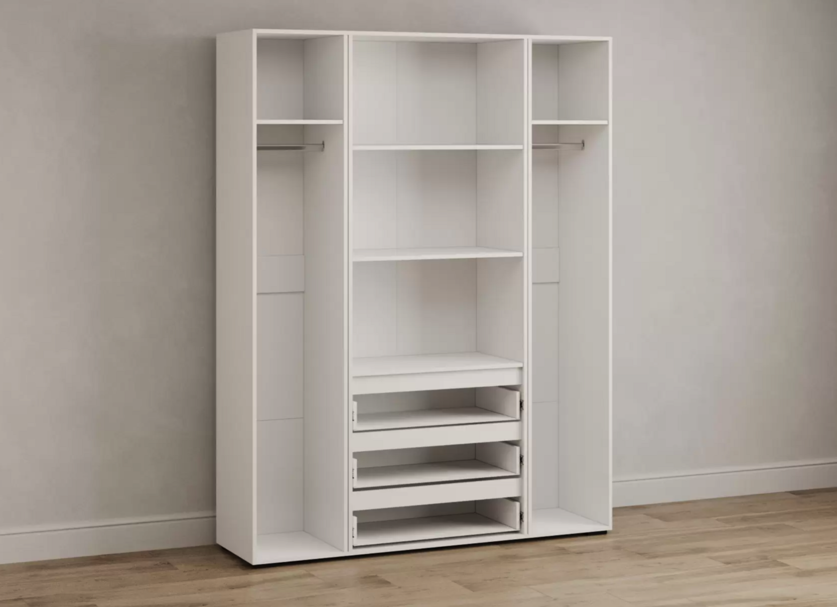 Распашной шкаф Bianca 2 — компактная модель, выполненная в эстетике минимализма. В комплектации с полками и ящиками шкаф подходит для хранения одежды в сложенном виде, белья и домашнего текстиля