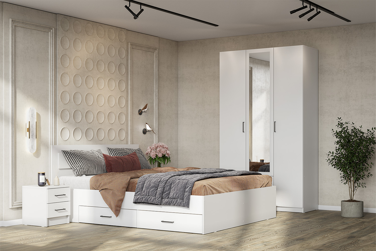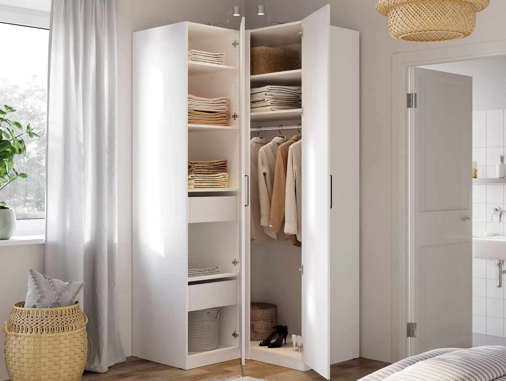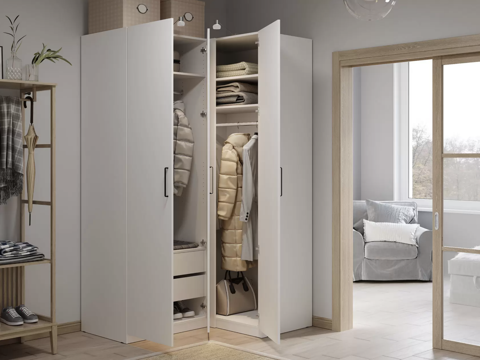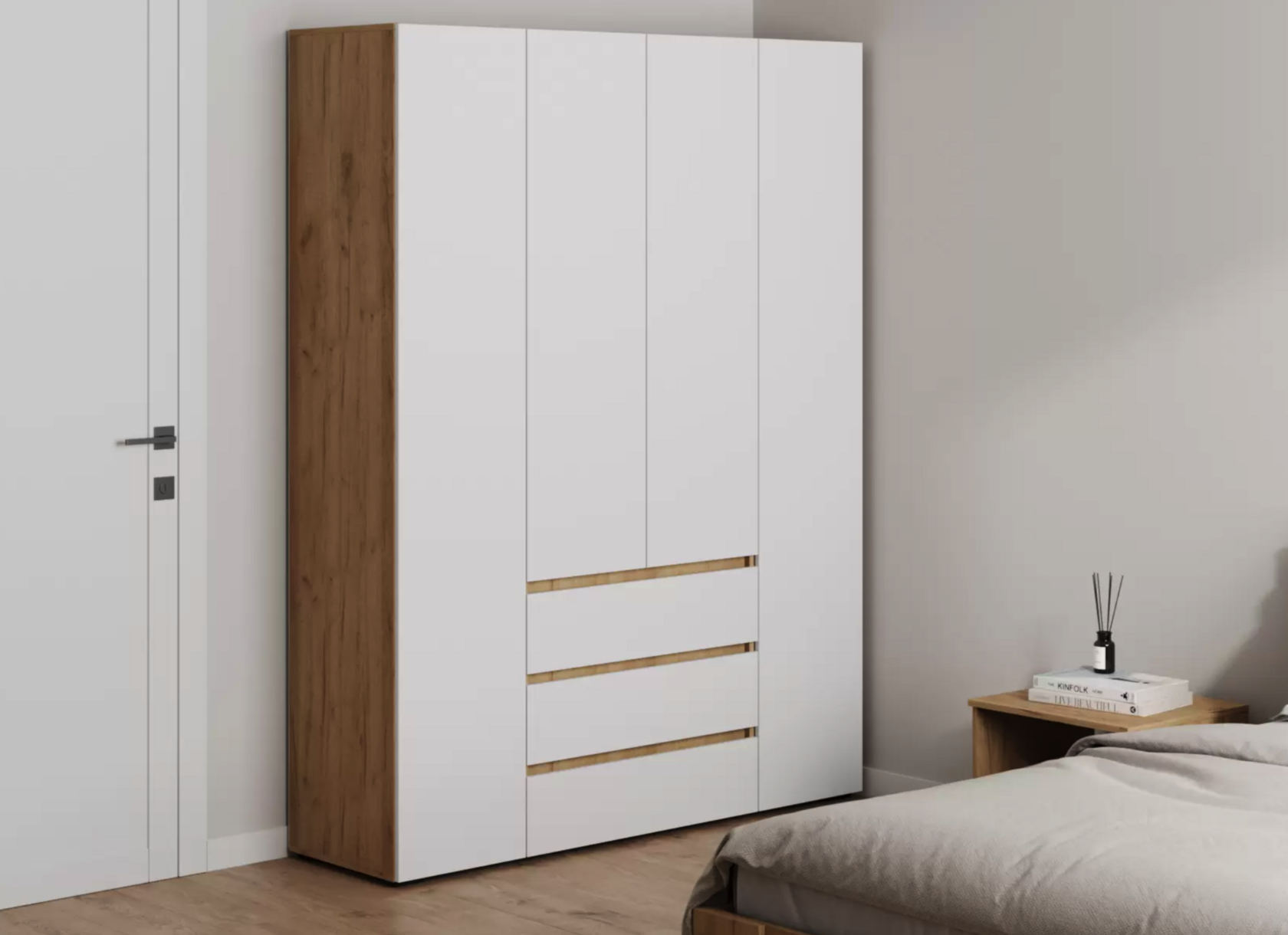 Распашной шкаф Bianca 2 — компактная модель, выполненная в эстетике минимализма. В комплектации с полками и ящиками шкаф подходит для хранения одежды в сложенном виде, белья и домашнего текстиля