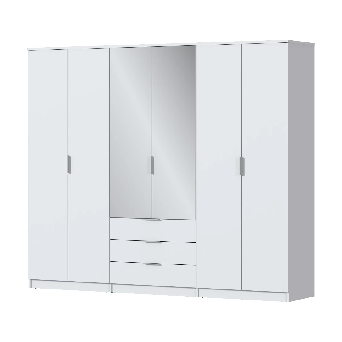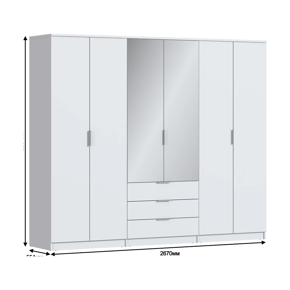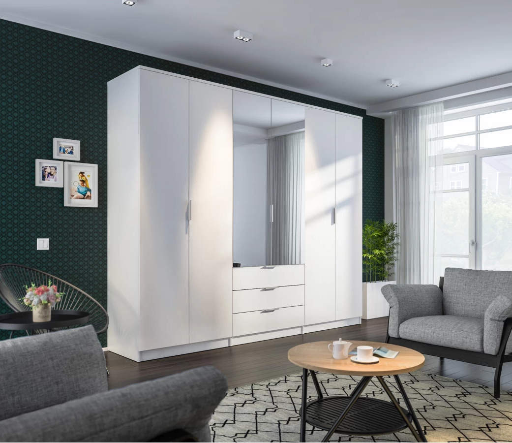 Шестидверный шкаф «Tanos» — практичное и стильное решение для хранения вещей. Имеет шесть распашных дверей, среди которых две с зеркальными вставками. В нижней части расположены три выдвижных ящика для мелких предметов. Подойдёт для спальни, прихожей или гостиной. Внутри есть штанга для одежды и полки