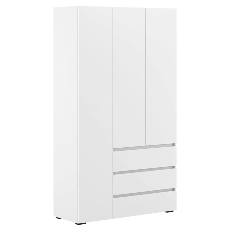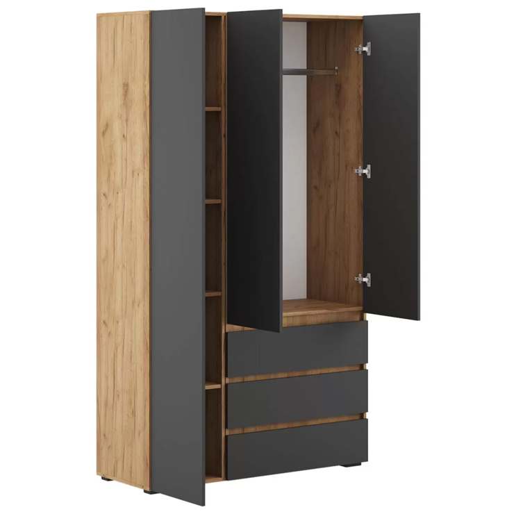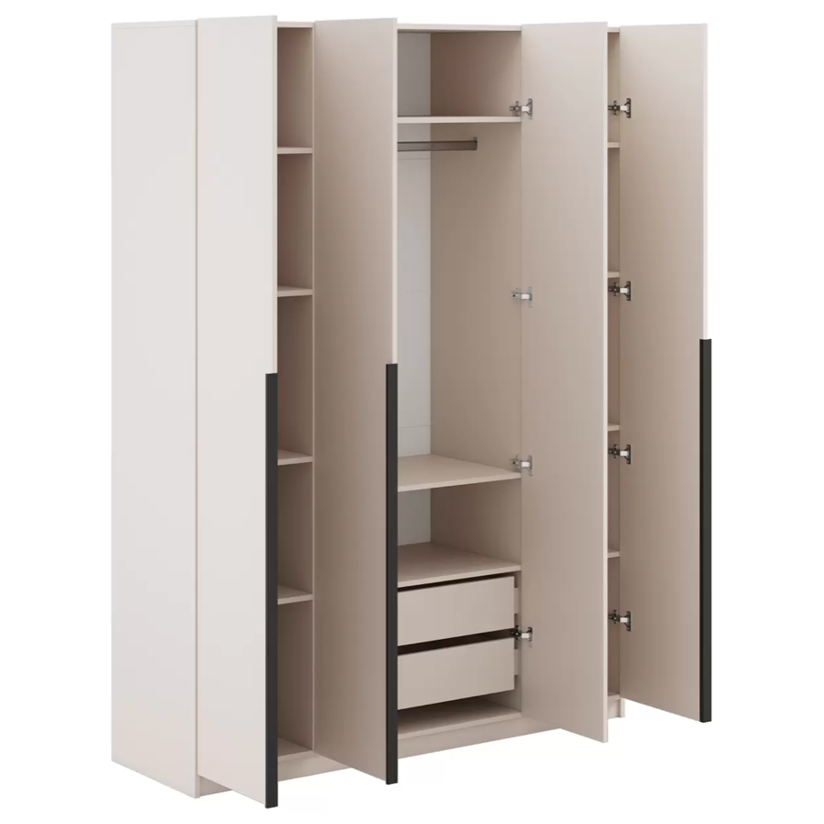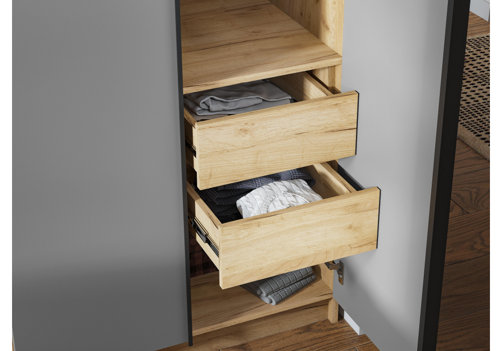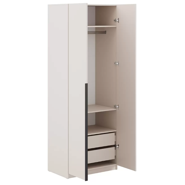 Распашной шкаф Tanya объединяет две вместительные секции для хранения. Несколько полок, ниша со штангой и пара выдвижных ящиков помогут удобно разместить любые предметы гардероба. Минималистичные фасады дополнены стильными контрастными ручками