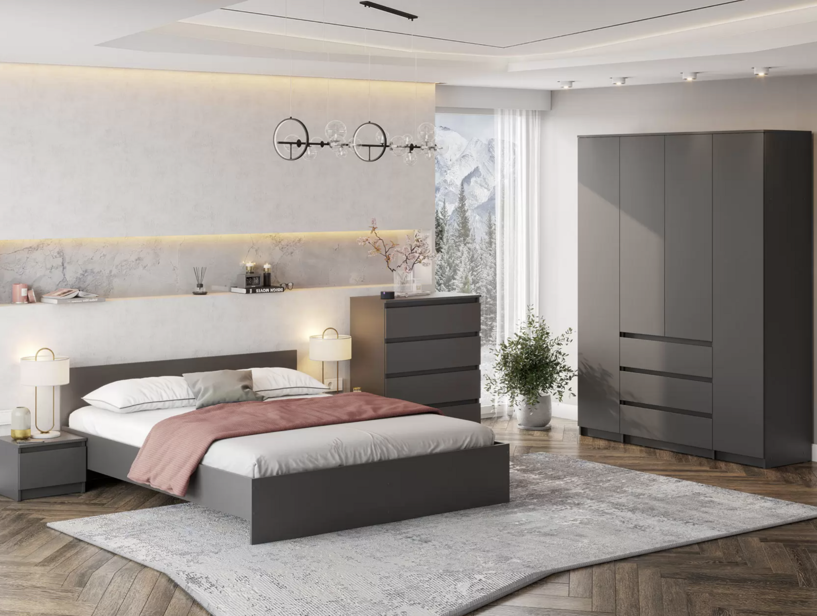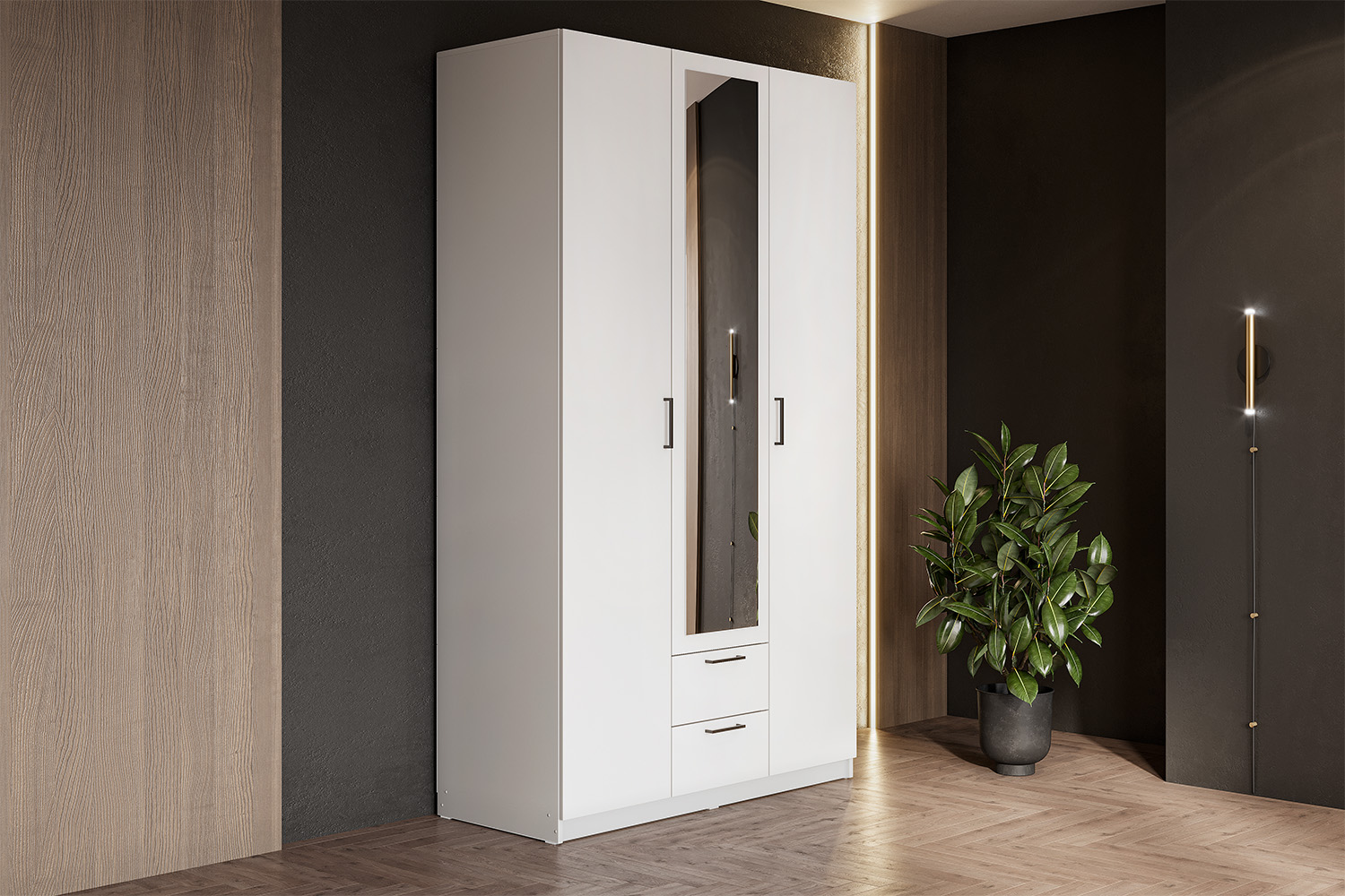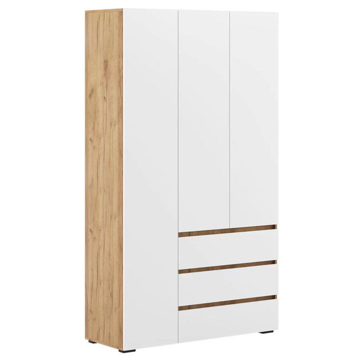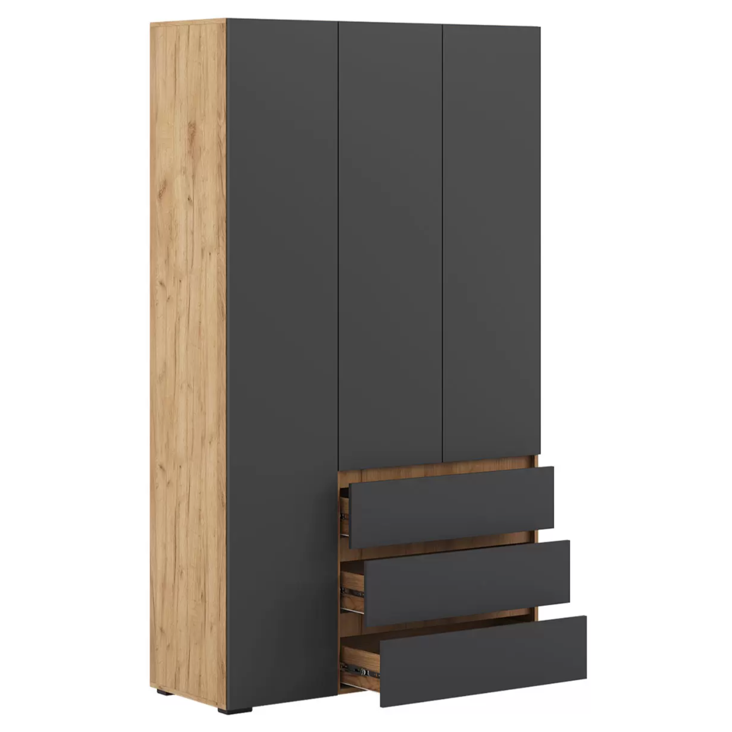 Распашной шкаф Tanya объединяет две вместительные секции для хранения. Несколько полок, ниша со штангой и пара выдвижных ящиков помогут удобно разместить любые предметы гардероба. Минималистичные фасады дополнены стильными контрастными ручками