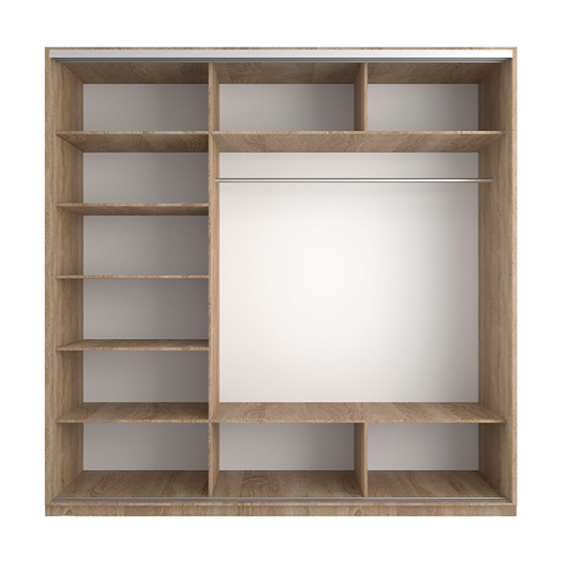 Лаконичный дизайн шкафа «Sola» позволяет поставить его в спальне, гостиной, прихожей и в офисе. Корпус модели выполнен из высококачественной ЛДСП. Наполнение шкафа состоит из двух отделений: одна часть уже другой, в ней расположены четыре полки для хранения сложенных вещей, внизу – два выдвижных ящика для мелких принадлежностей. Во второй части – две полки и одна выдвижная штанга для размещения одежды на вешалках, внизу есть ниша для обуви