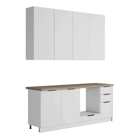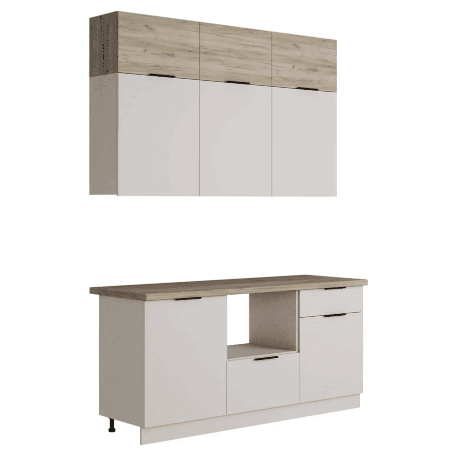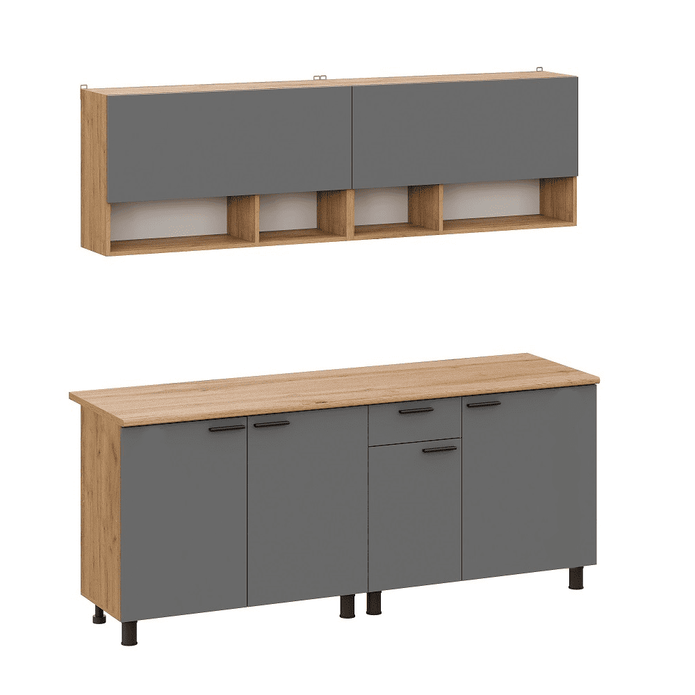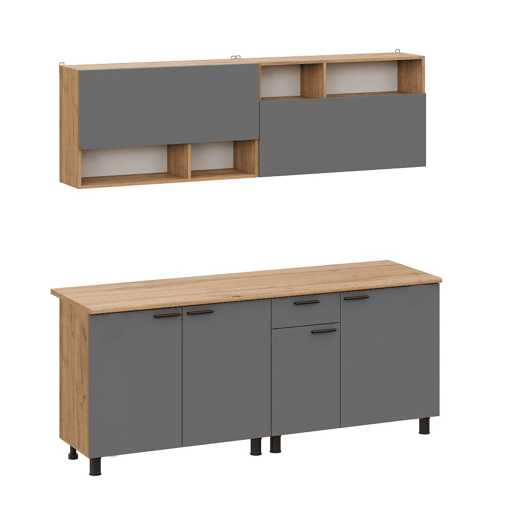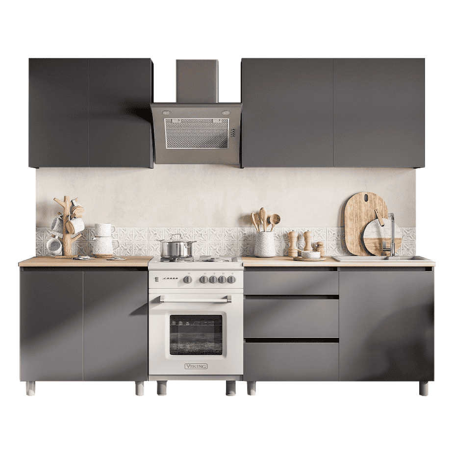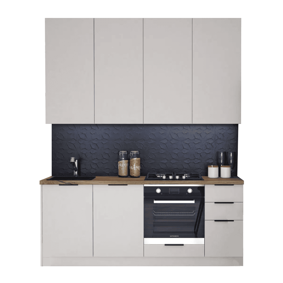 Кухонный гарнитур Eva поможет создать эстетичное и функциональное пространство. Прямая конфигурация и небольшие габариты делают комплект идеальным выбором для квартиры-студии. Набор включает практичные элементы для хранения и позволяет обустроить удобную рабочую поверхность