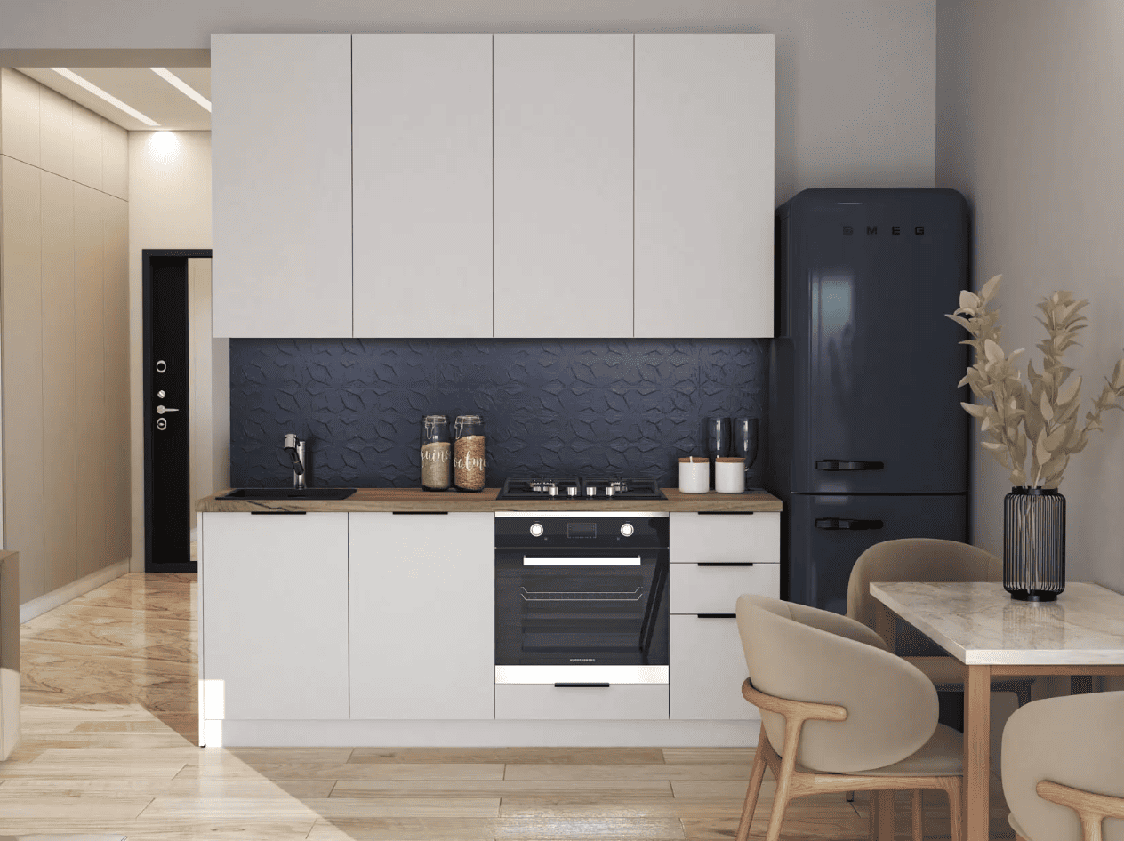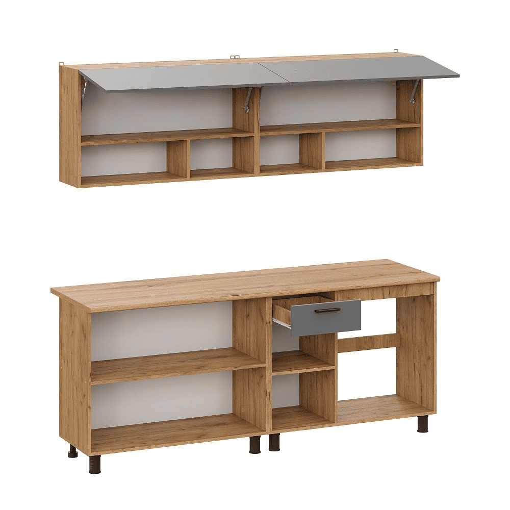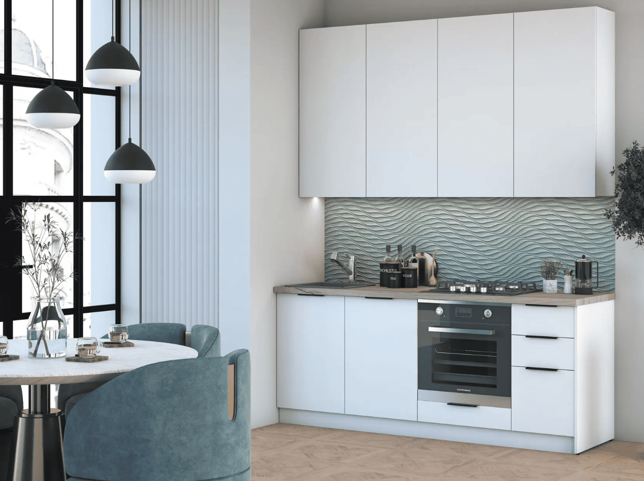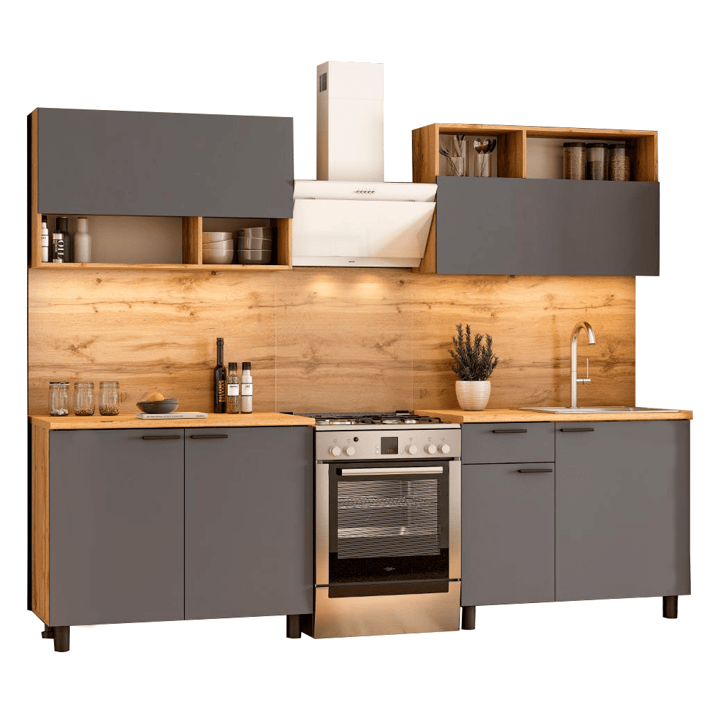Кухонный гарнитур Eva поможет создать эстетичное и функциональное пространство. Прямая конфигурация и небольшие габариты делают комплект идеальным выбором для квартиры-студии. Набор включает практичные элементы для хранения и позволяет обустроить удобную рабочую поверхность
