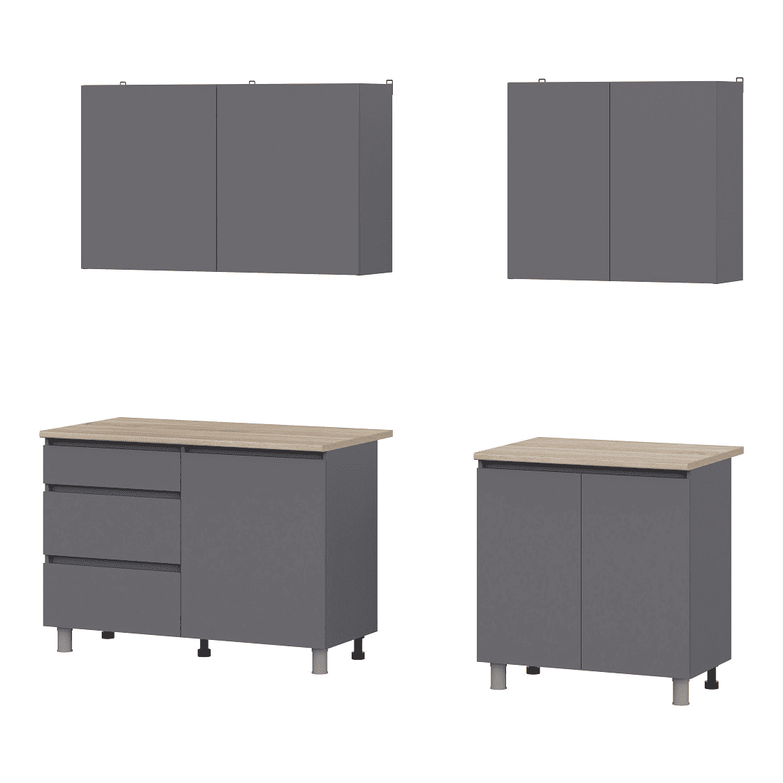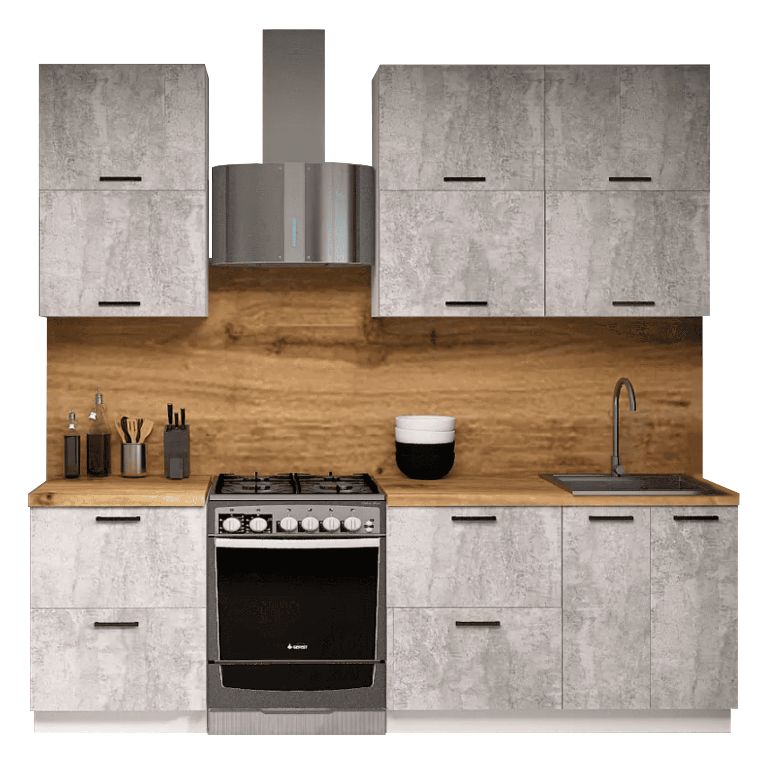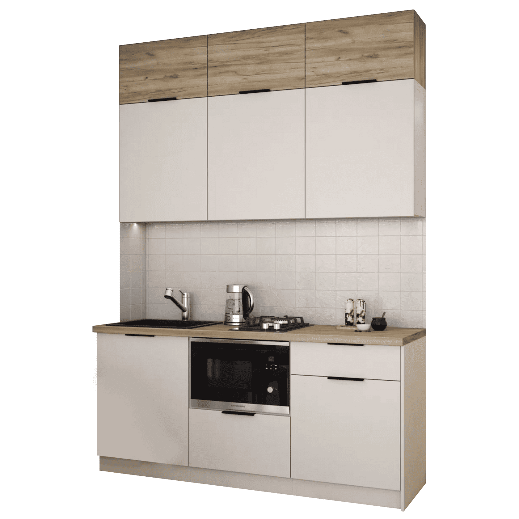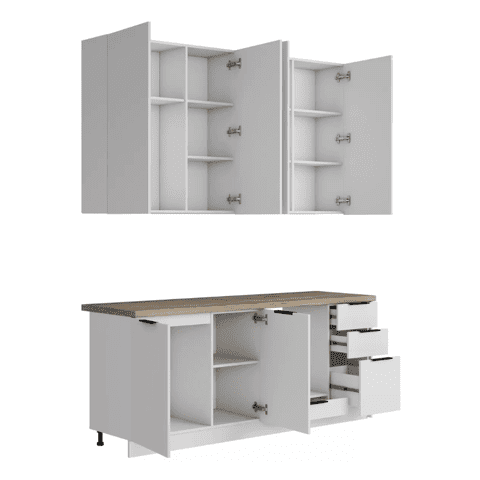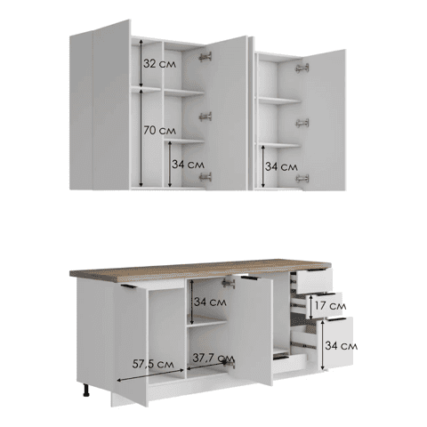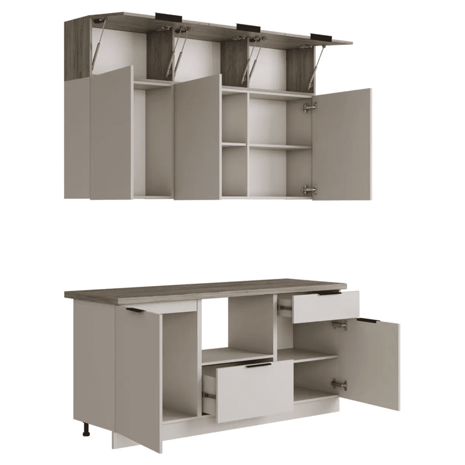 Кухонный гарнитур Eva поможет создать эстетичное и функциональное пространство. Прямая конфигурация и небольшие габариты делают комплект идеальным выбором для квартиры-студии. Набор включает практичные элементы для хранения и позволяет обустроить удобную рабочую поверхность