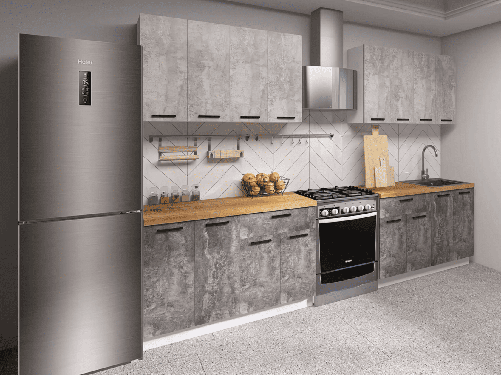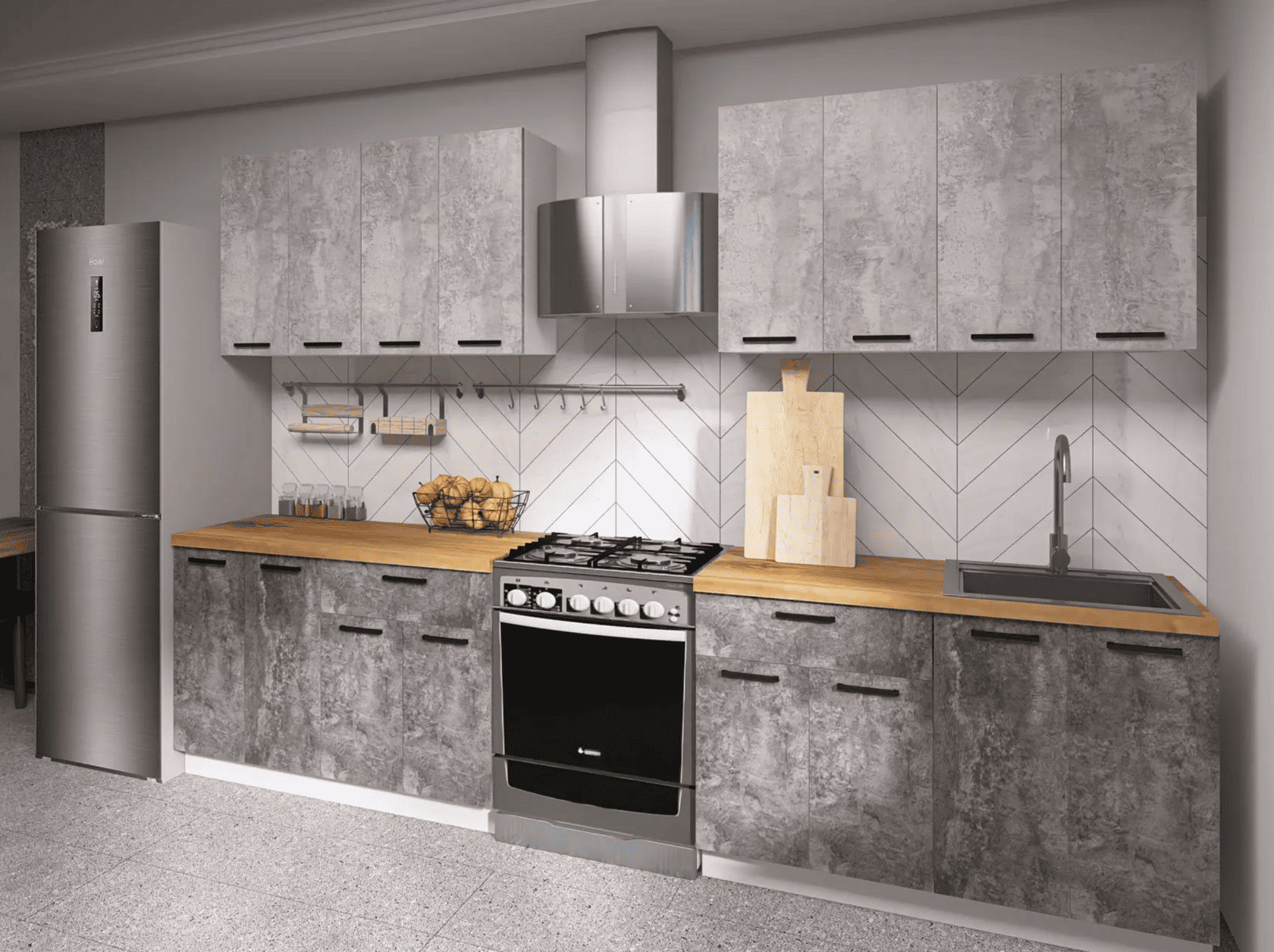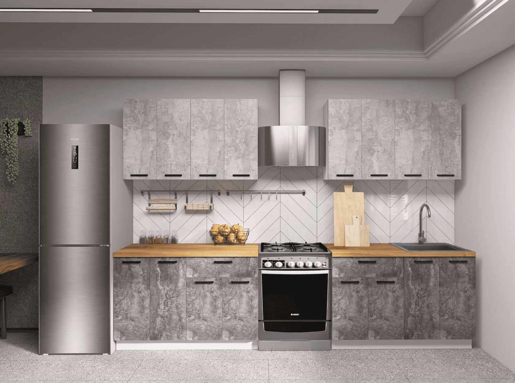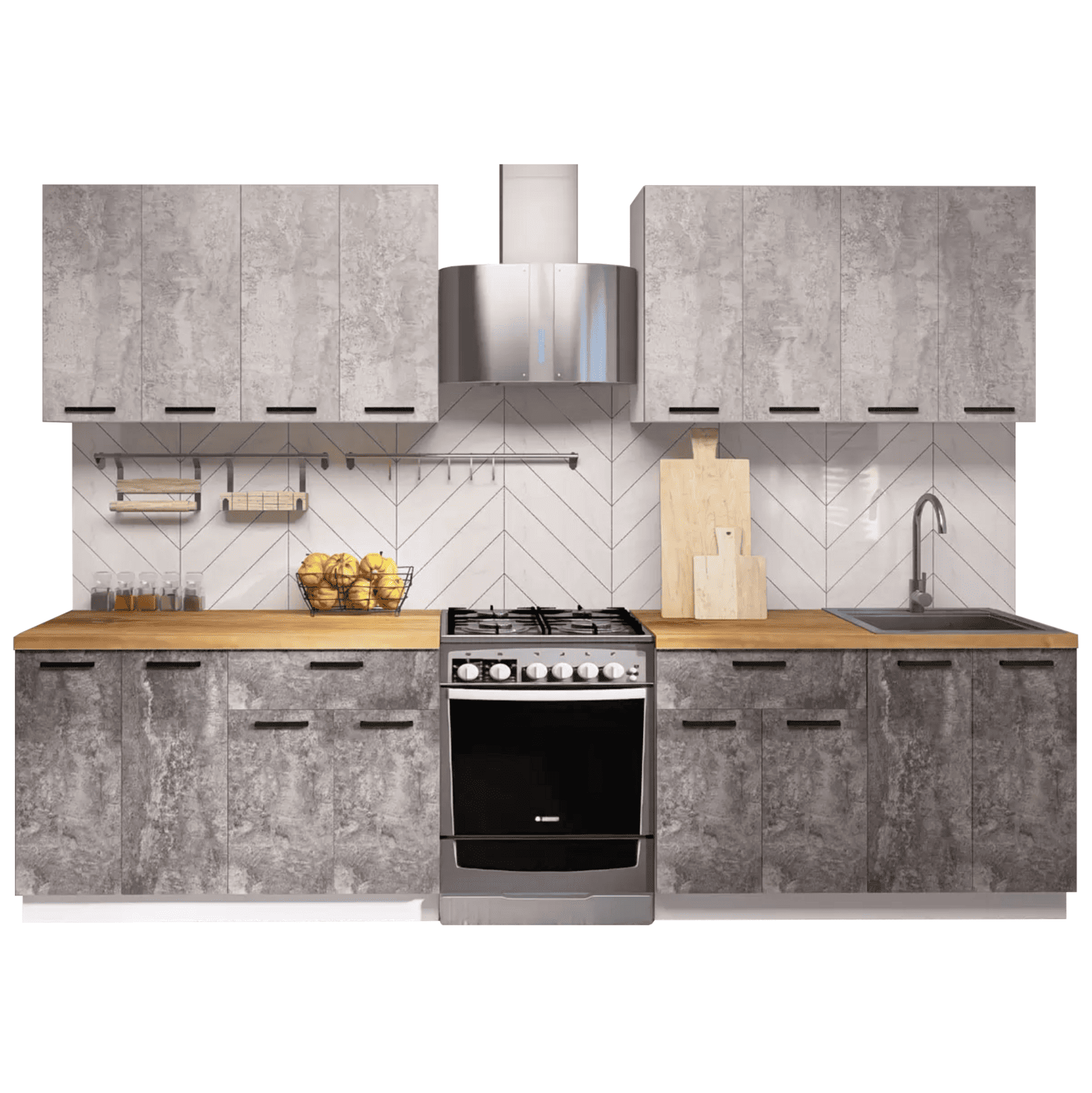 Кухонный гарнитур Eva поможет создать эстетичное и функциональное пространство. Прямая конфигурация и небольшие габариты делают комплект идеальным выбором для квартиры-студии. Набор включает практичные элементы для хранения и позволяет обустроить удобную рабочую поверхность