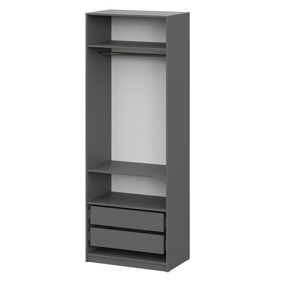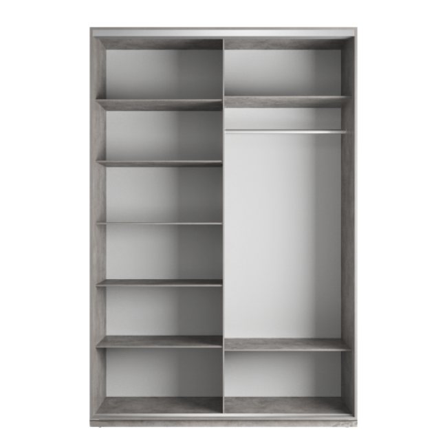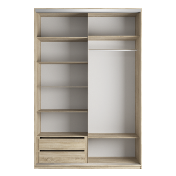 Лаконичный дизайн шкафа Ornella позволяет поставить его в спальне, гостиной, прихожей и в офисе. Корпус модели выполнен из высококачественной ЛДСП. Наполнение шкафа состоит из двух отделений: одна часть уже другой, в ней расположены четыре полки для хранения сложенных вещей, внизу – два выдвижных ящика для мелких принадлежностей. Во второй части – две полки и одна выдвижная штанга для размещения одежды на вешалках, внизу есть ниша для обуви