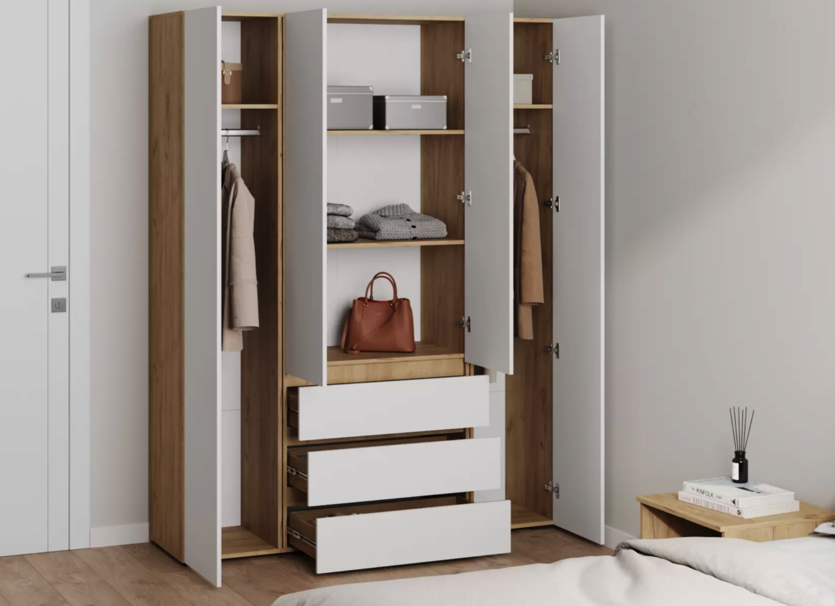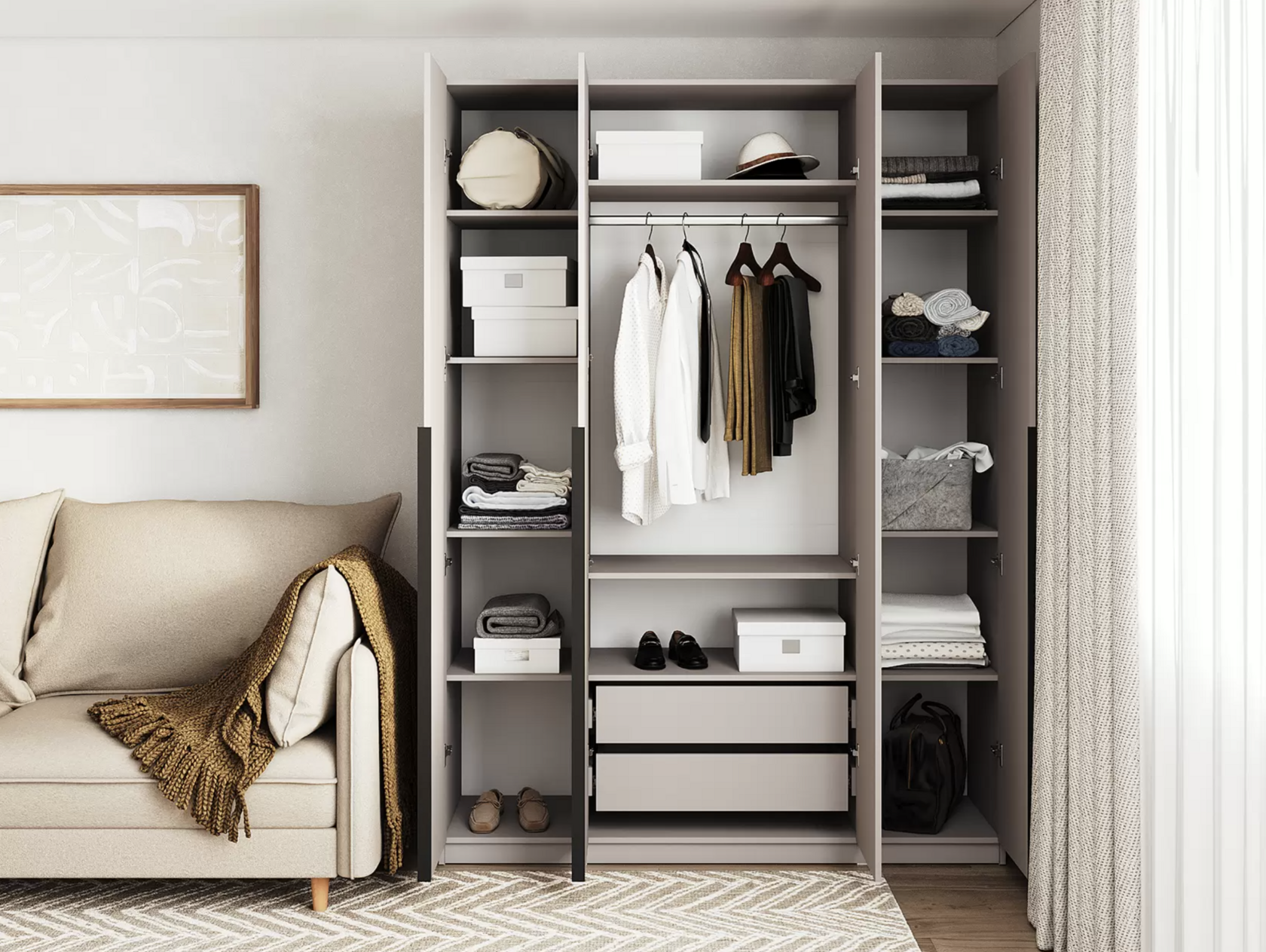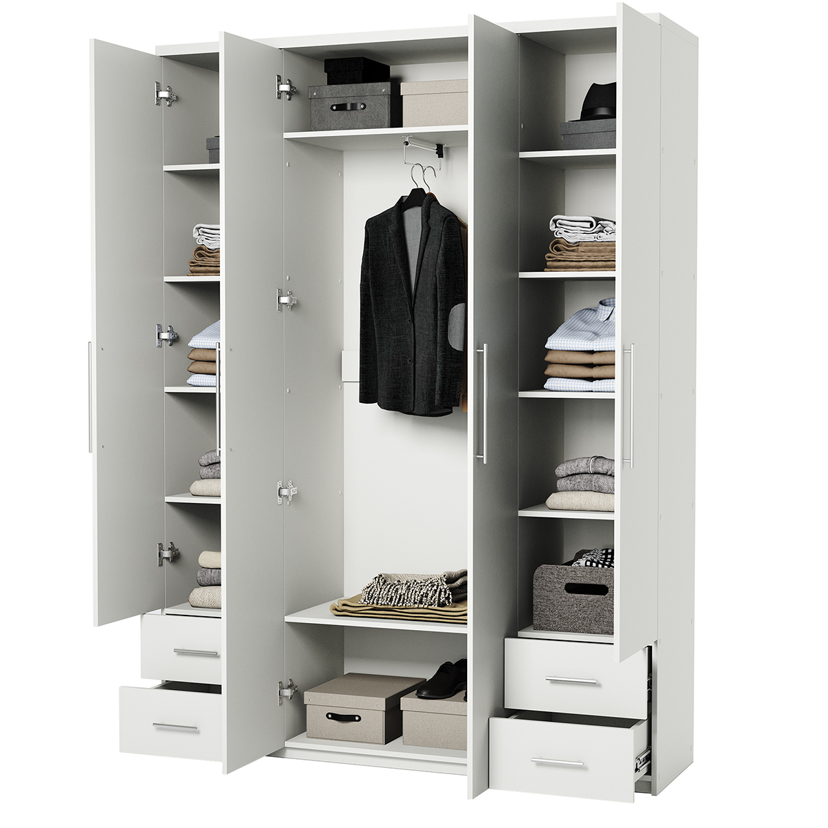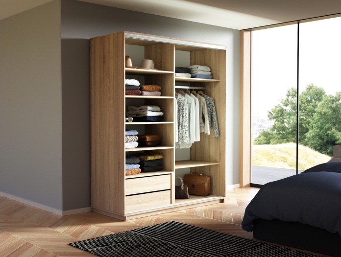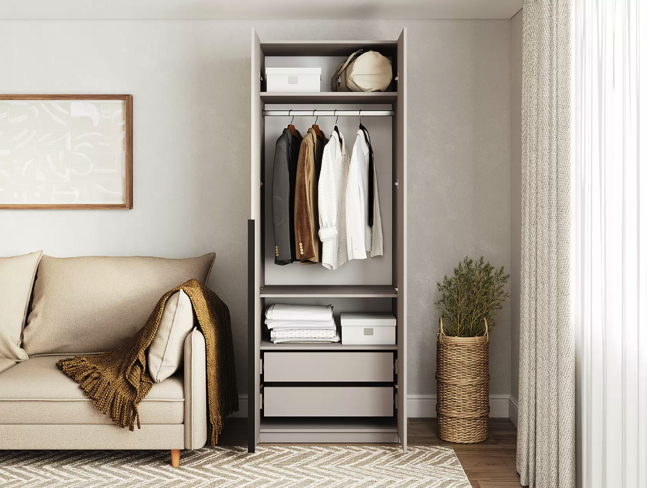 Шкаф «Samo» можно установить в любой комнате квартиры или офиса. Наполнение шкафа состоит из полок для хранения вещей в сложенном виде, одной штанги для вешалок из хромированного металла и двух выдвижных ящиков, которые легко открываются, обеспечивая удобное хранение нужных вещей