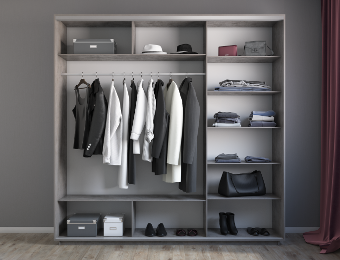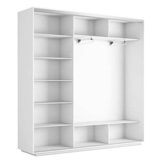 Шкаф «Libra» можно установить в любой комнате квартиры или офиса. Наполнение шкафа представлено двумя отделениями: в одном – установлены пять полок для хранения сложенных вещей, в другом – две полки и хромированная выдвижная штанга для размещения одежды на вешалках, внизу есть ниша для обуви