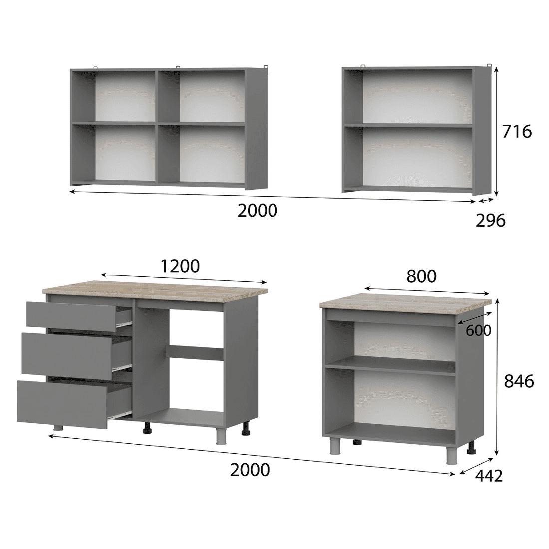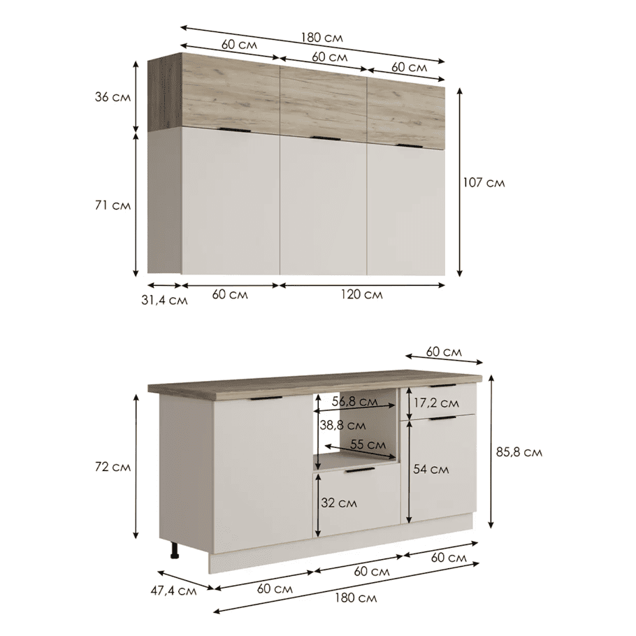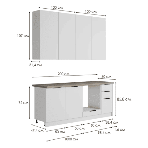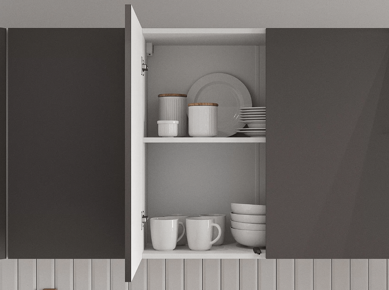 Кухонный гарнитур Carmen — идеальное решение для вашей кухни. Длина кухонного гарнитура составляет 2 метра. Гарнитур состоит из удобных шкафов, ящиков и столешниц, обеспечивая максимальную функциональность и комфорт при готовке. Верхние шкафы можно устанавливать как сверху открытыми нишами, так и снизу, модуль переворачивается
