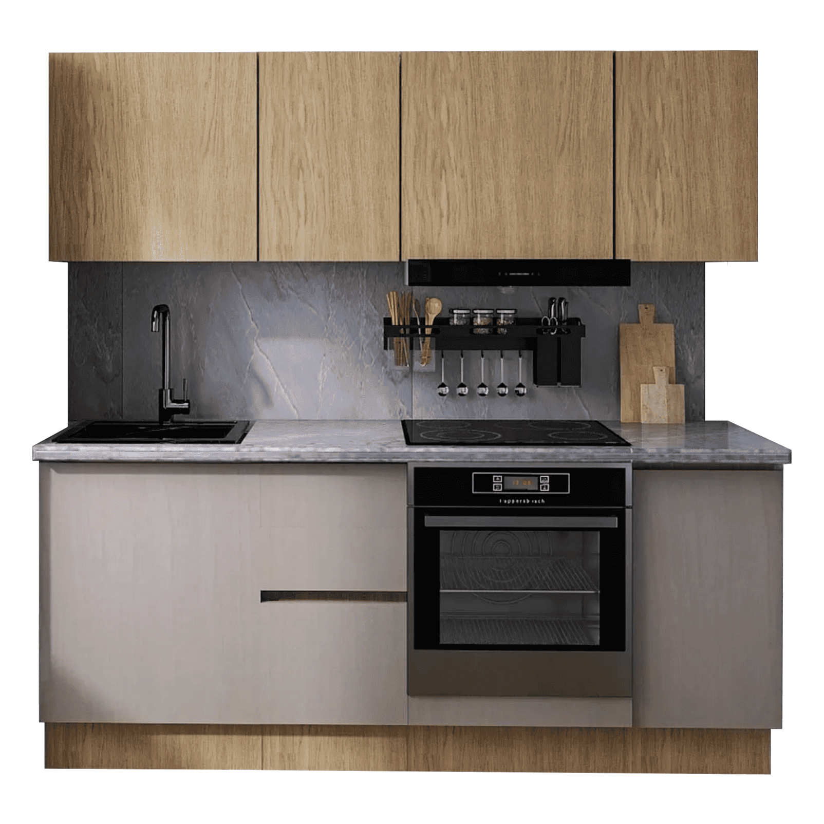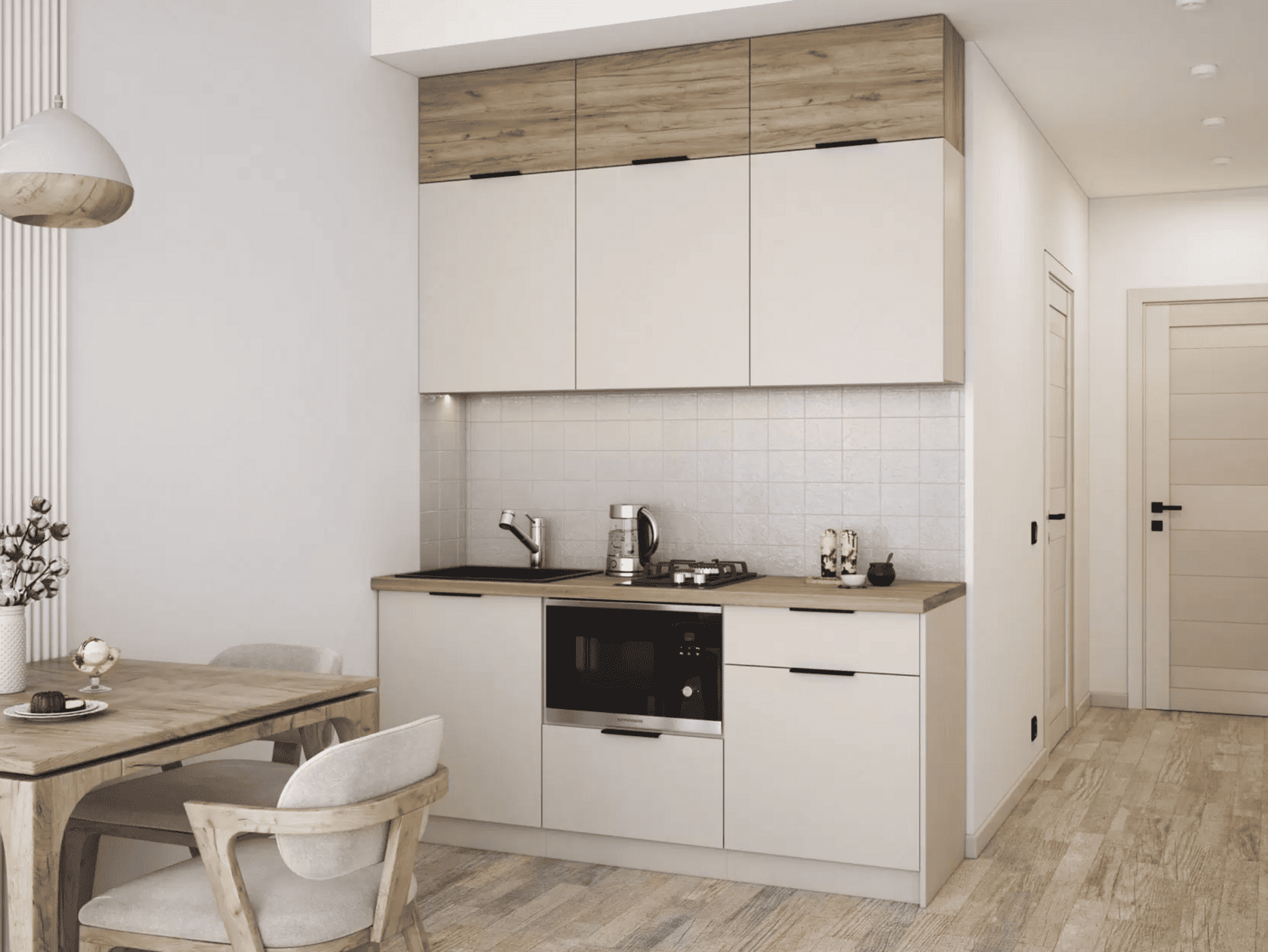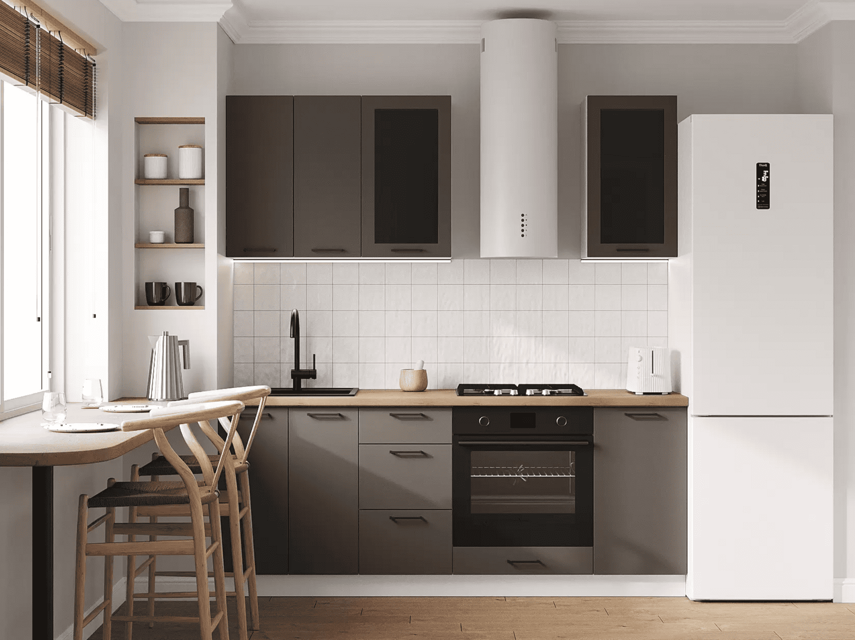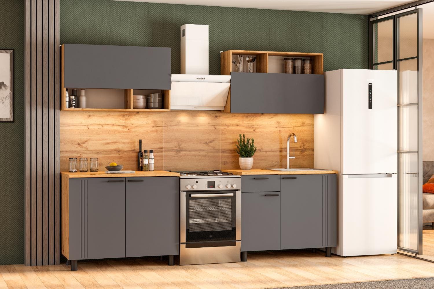 Кухонный гарнитур Mia — современное функциональное решение для обустройства небольшого помещения. Компактные элементы помогут оптимизировать пространство. Сочетание древесной текстуры и матовых фасадов с контрастными ручками позволяет создать аккуратный и привлекательный интерьер