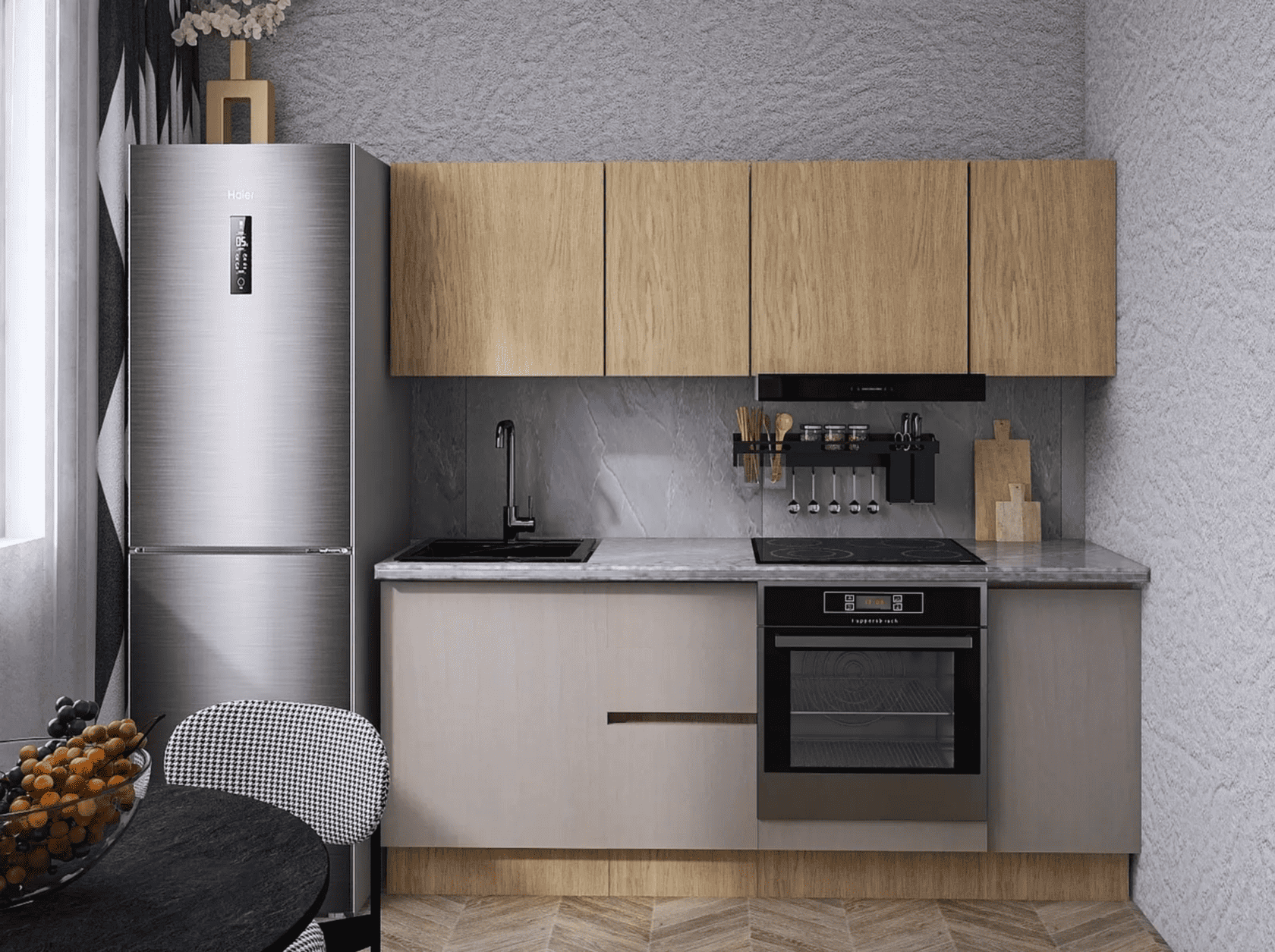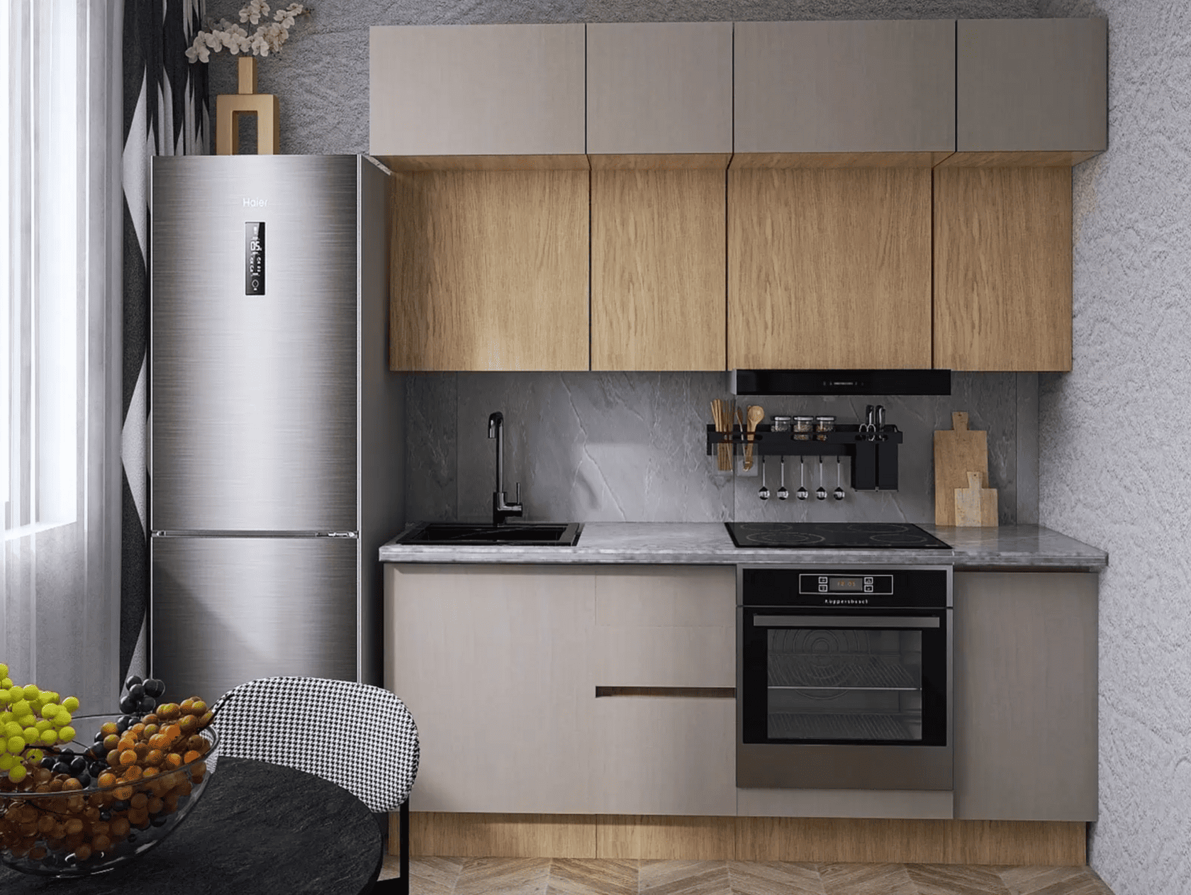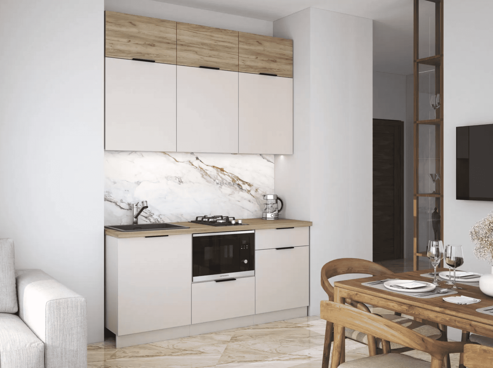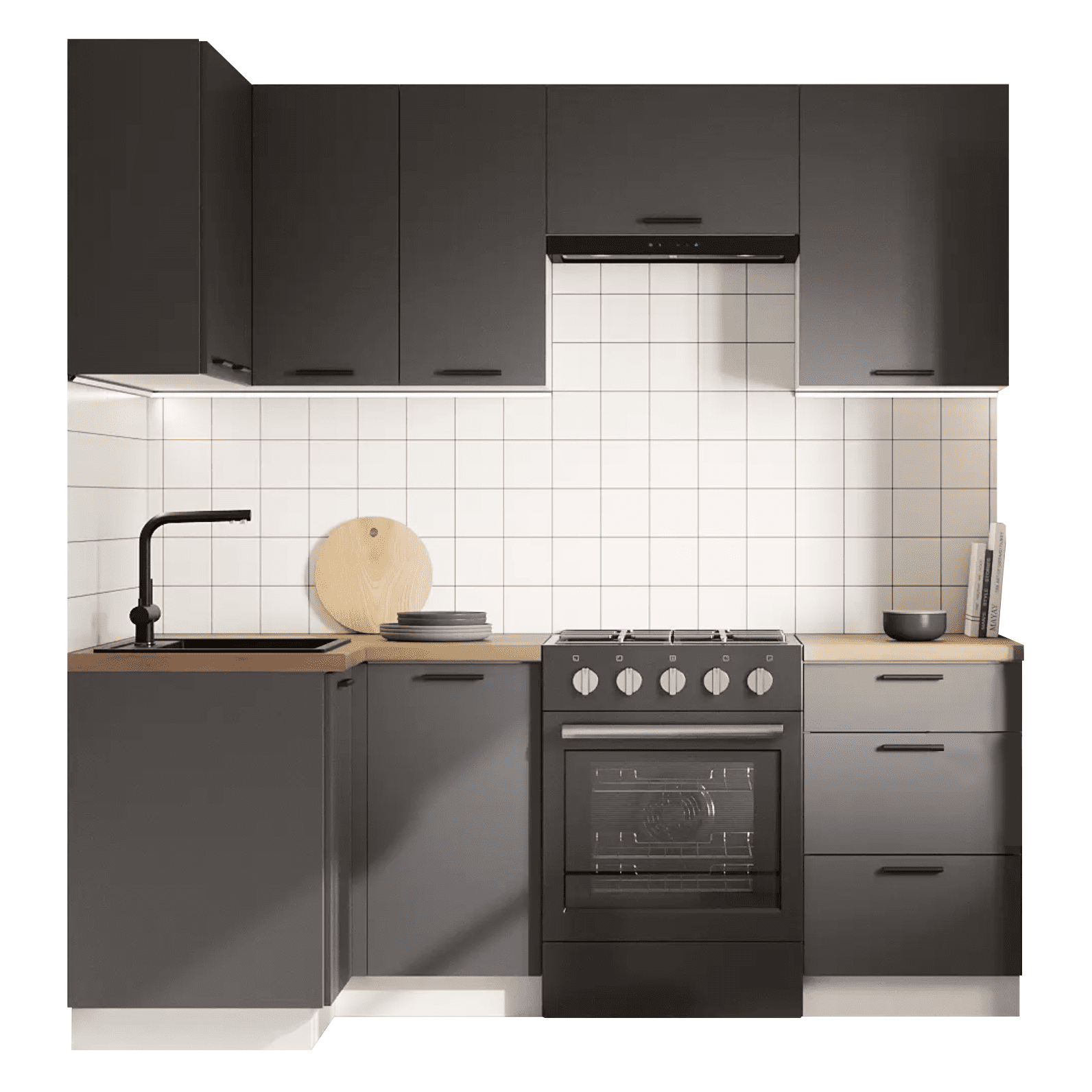Кухонный гарнитур Mia — современное функциональное решение для обустройства небольшого помещения. Компактные элементы помогут оптимизировать пространство. Сочетание древесной текстуры и матовых фасадов с контрастными ручками позволяет создать аккуратный и привлекательный интерьер