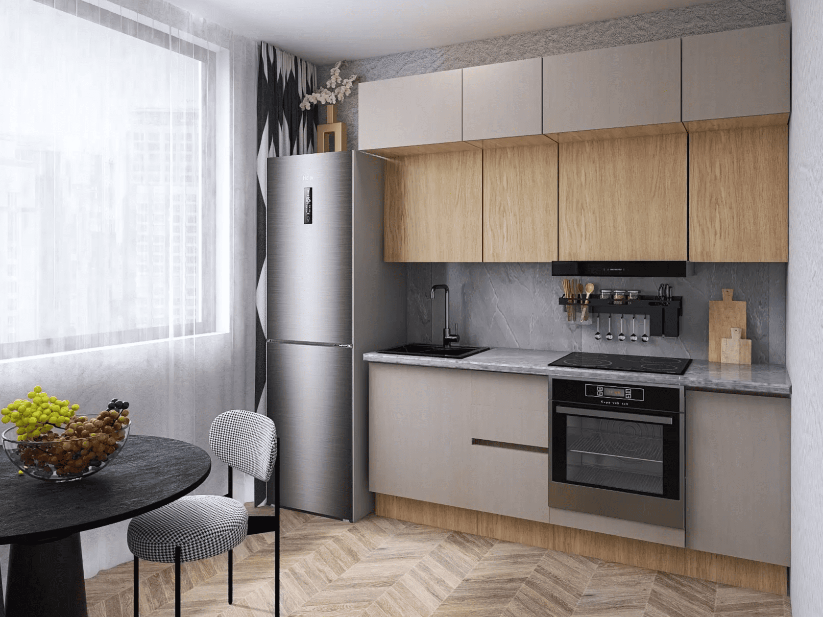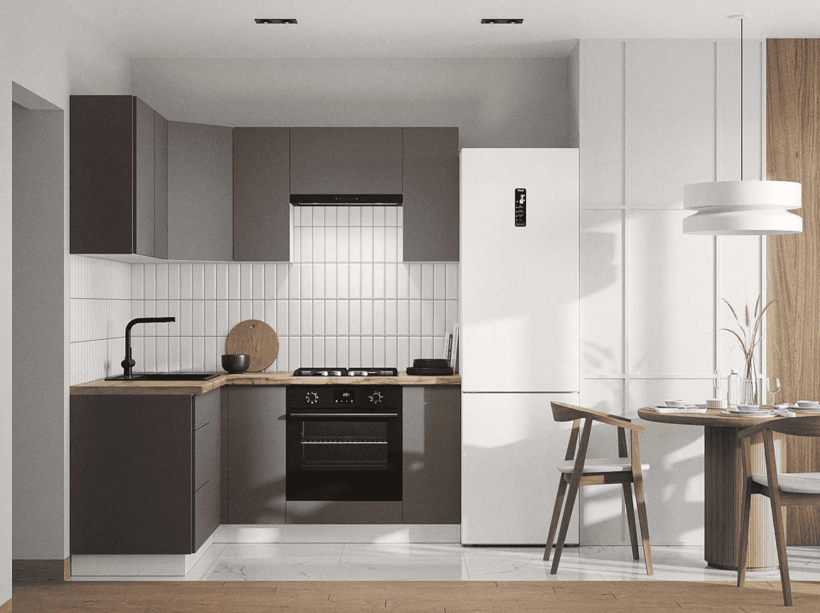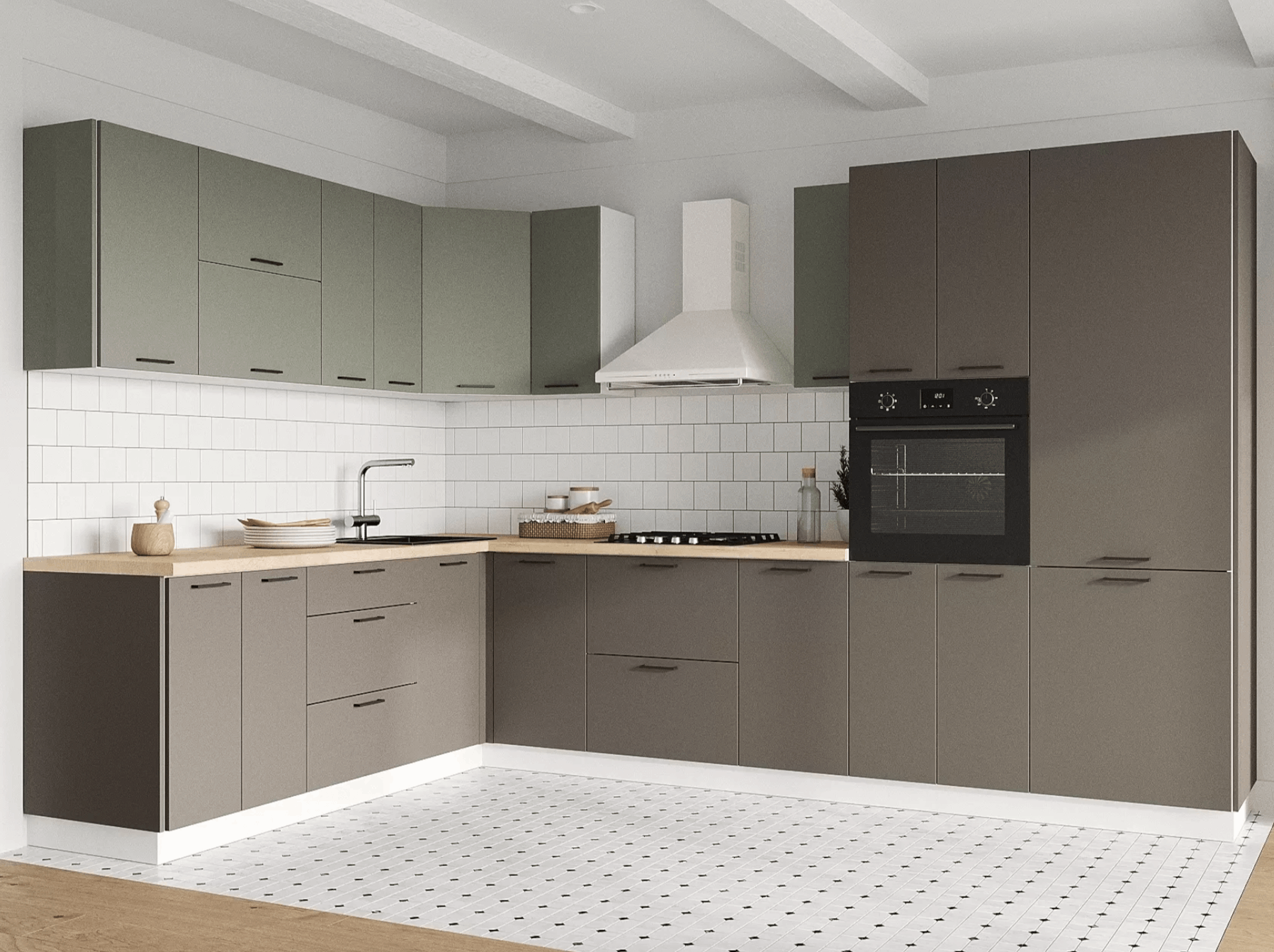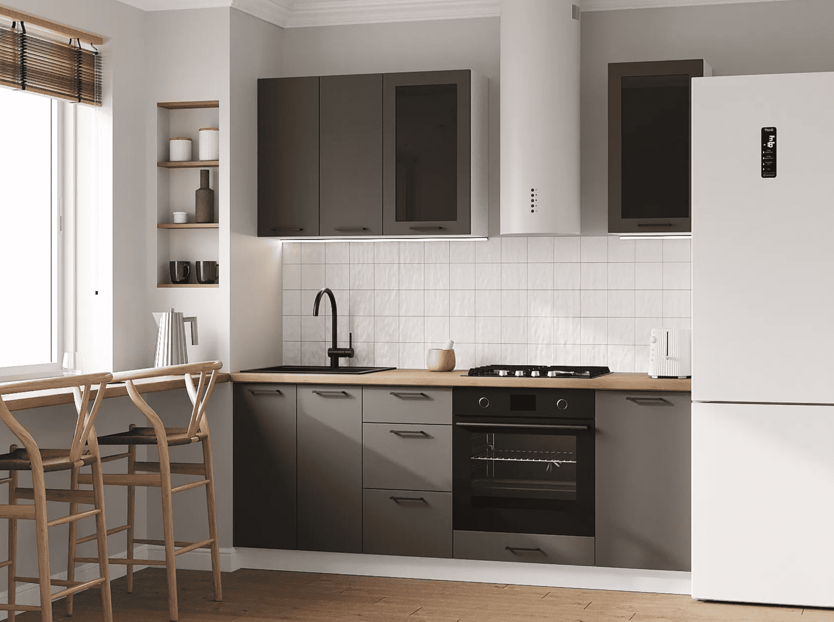 Кухонный гарнитур Mia — современное функциональное решение для обустройства небольшого помещения. Компактные элементы помогут оптимизировать пространство. Сочетание древесной текстуры и матовых фасадов с контрастными ручками позволяет создать аккуратный и привлекательный интерьер