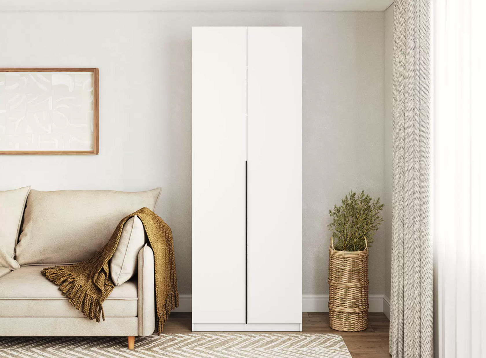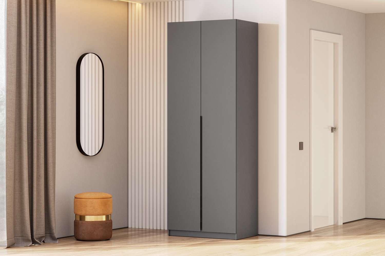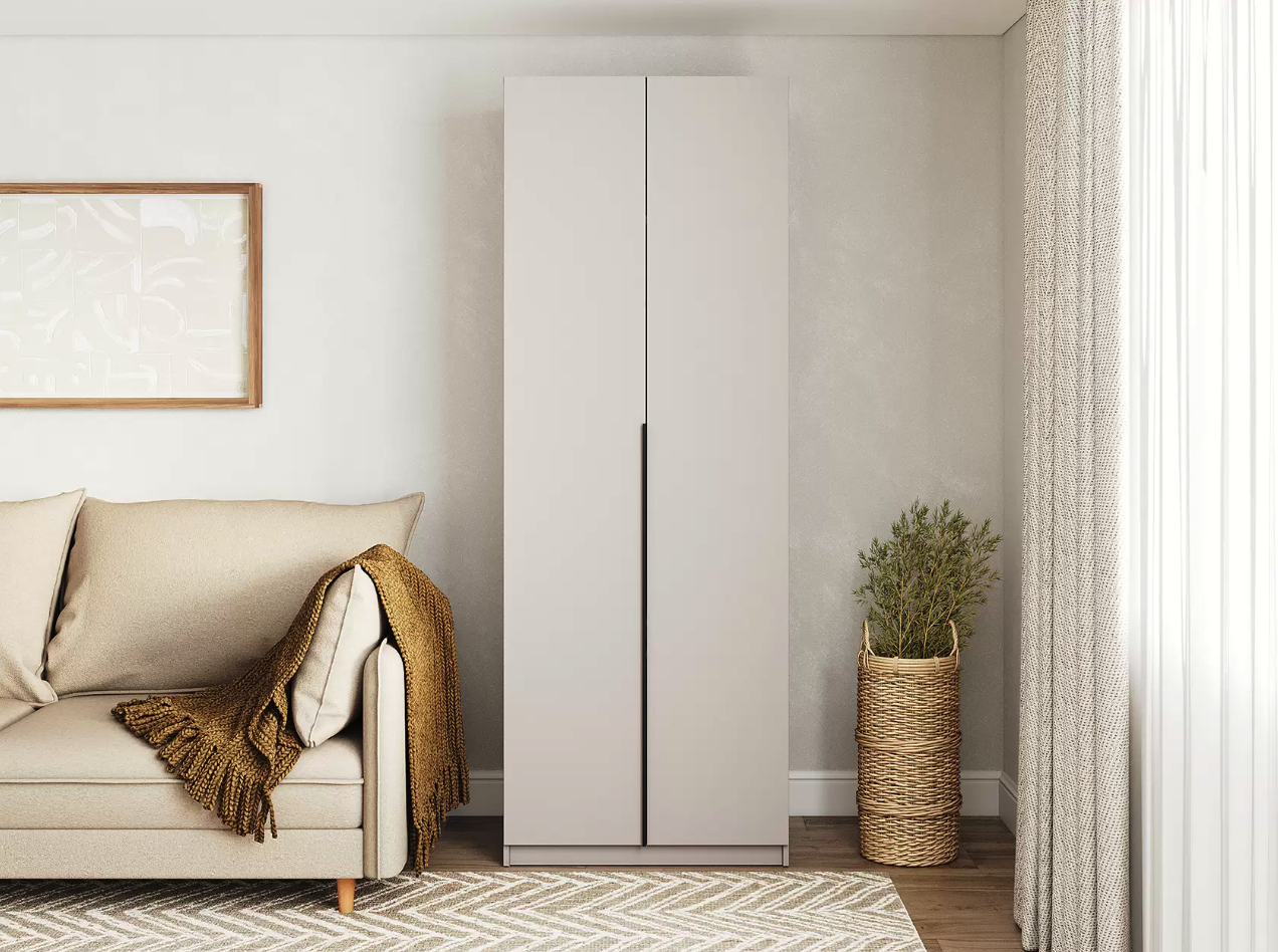 Двухдверный распашной шкаф «Liva» — стильное и практичное решение для дома. Матовая поверхность, лаконичная чёрная алюминиевая ручка, прочные петли с доводчиками. Внутри — штанга для вешалок. Компактный, но вместительный. Подходит для спальни, детской, прихожей. Легко собирается