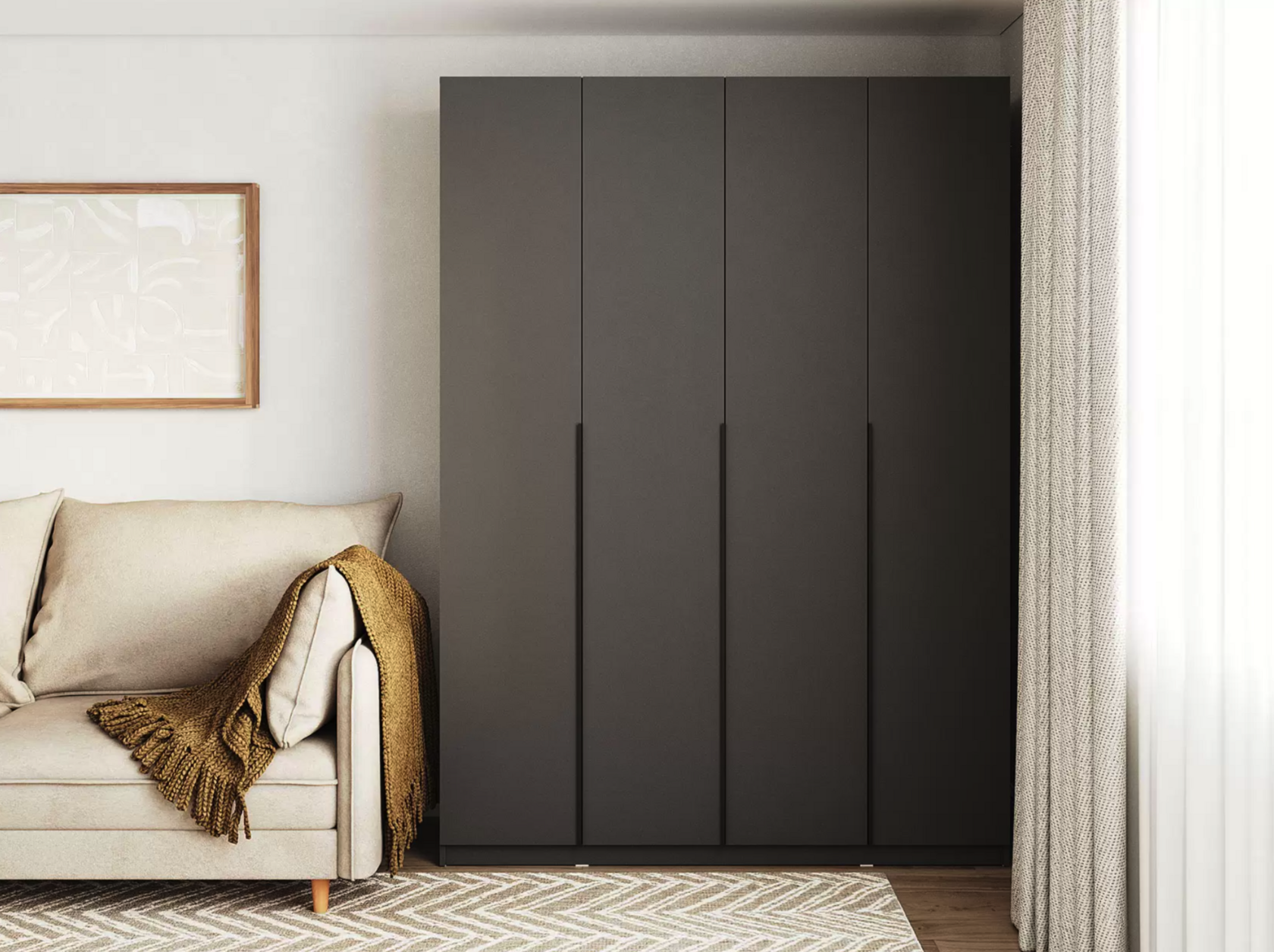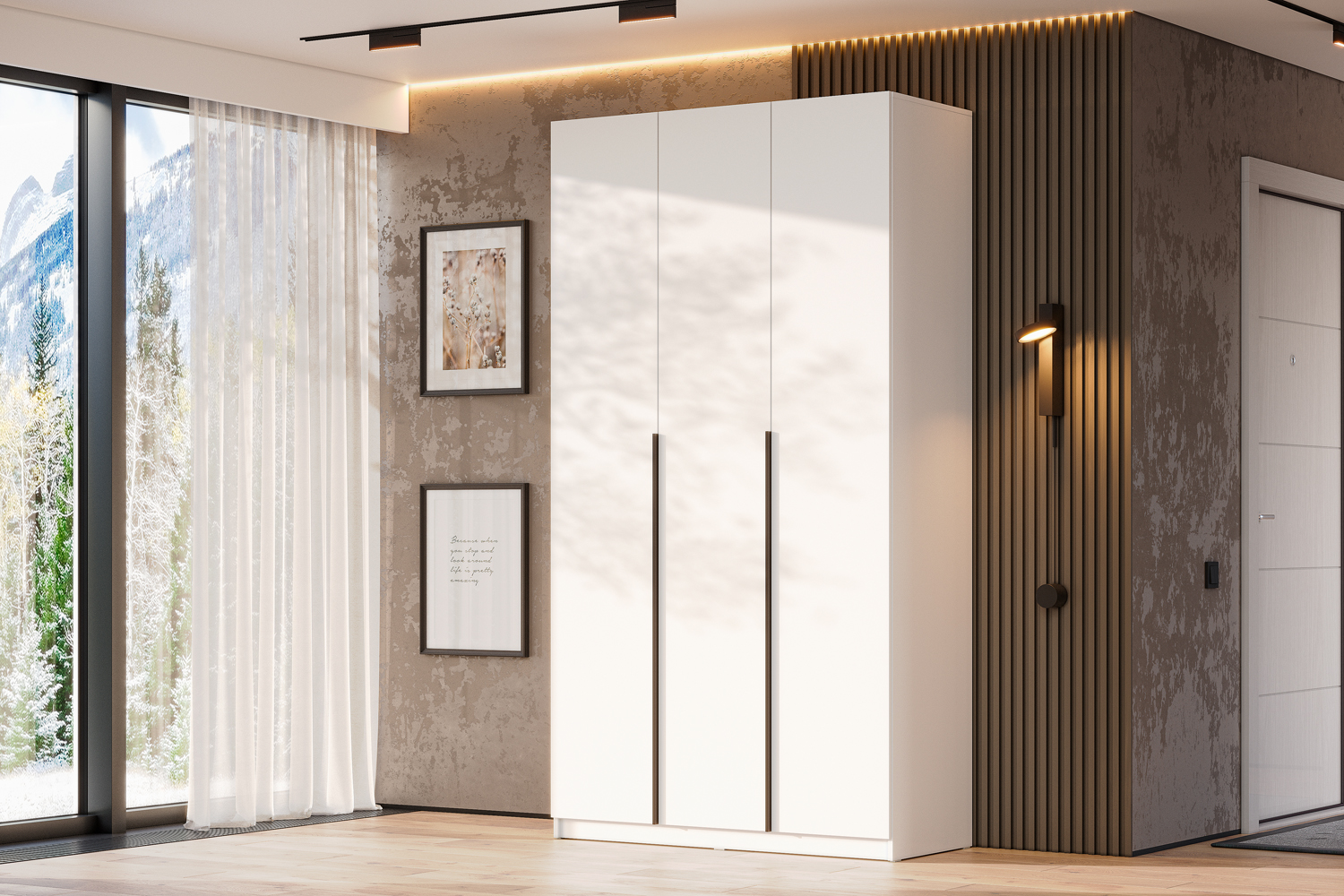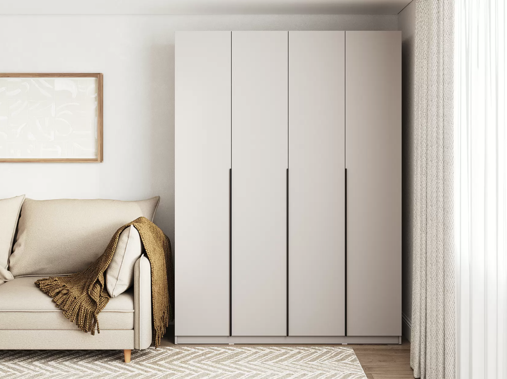 Двухдверный распашной шкаф «Liva» — стильное и практичное решение для дома. Матовая поверхность, лаконичная чёрная алюминиевая ручка, прочные петли с доводчиками. Внутри — штанга для вешалок. Компактный, но вместительный. Подходит для спальни, детской, прихожей. Легко собирается