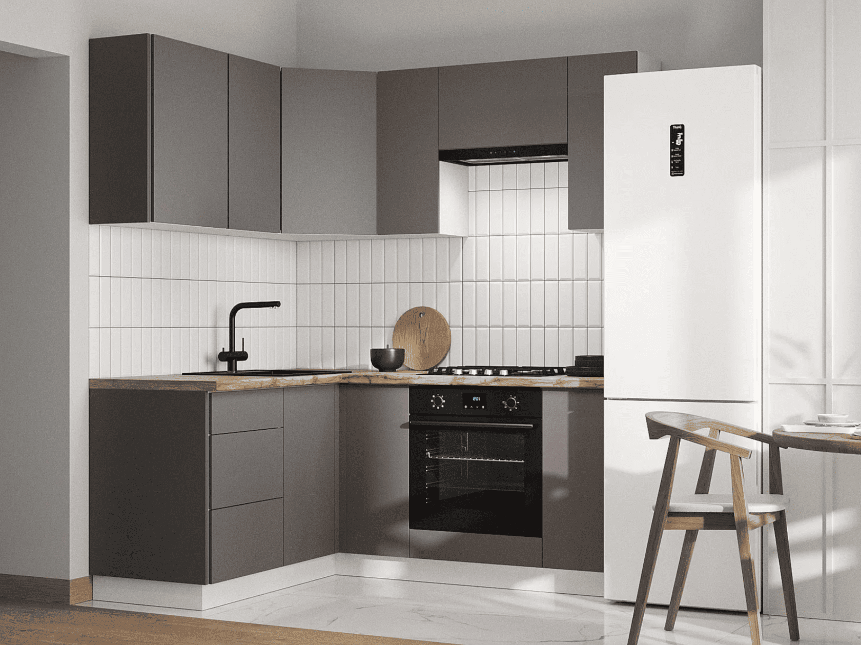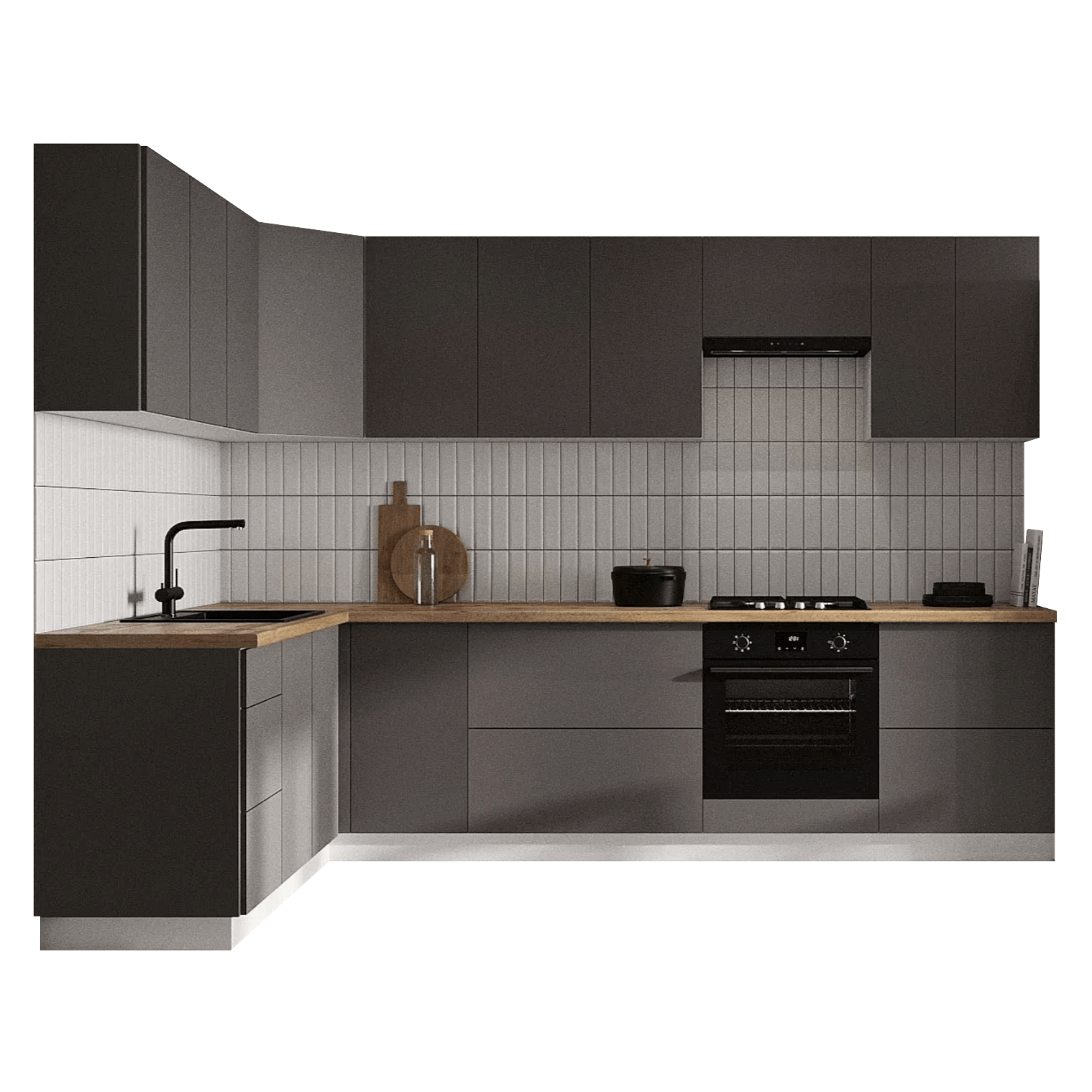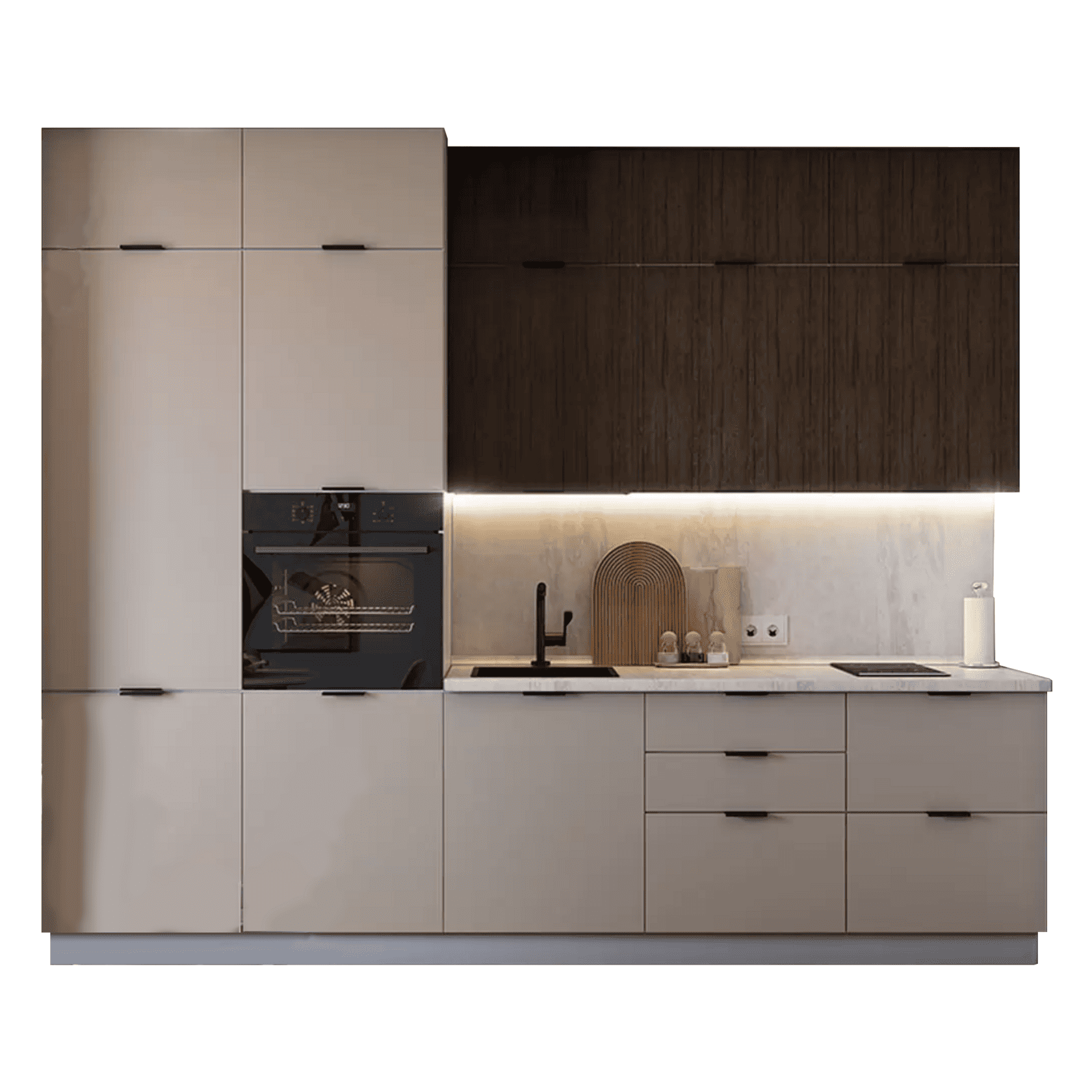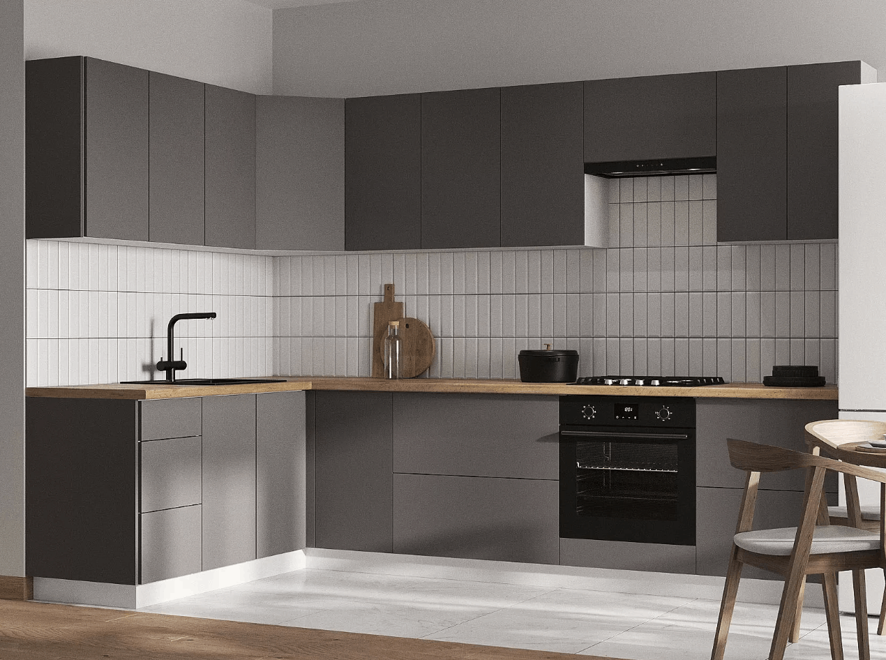 Кухонный гарнитур Triana — функциональное решение для ценителей современного минималистичного дизайна, которое позволит эффективно организовать пространство для хранения посуды и хозяйственных принадлежностей. Благодаря петлям с доводчиками и шариковым направляющим, дверцы и ящики двигаются плавно и бесшумно. Отсутствие внешней фурнитуры создает эффект монолитности, придавая гарнитуру стильный внешний вид. Антресольные шкафы открываются нажатием, а также оснащены газлифтами, что позволит избежать хлопков и резкого закрывания