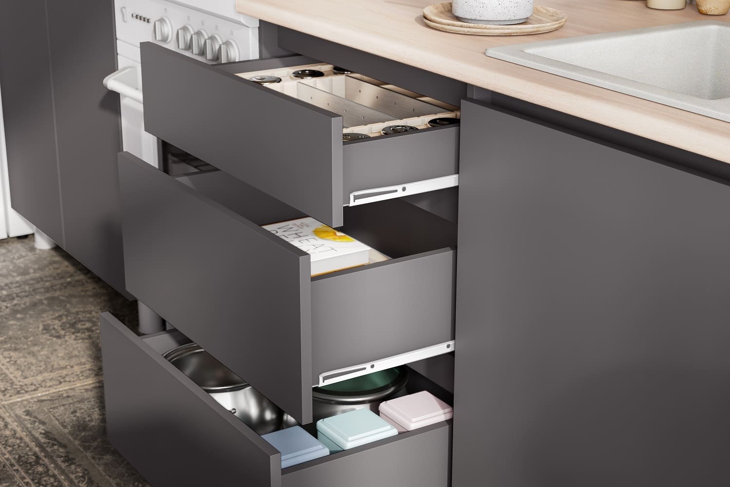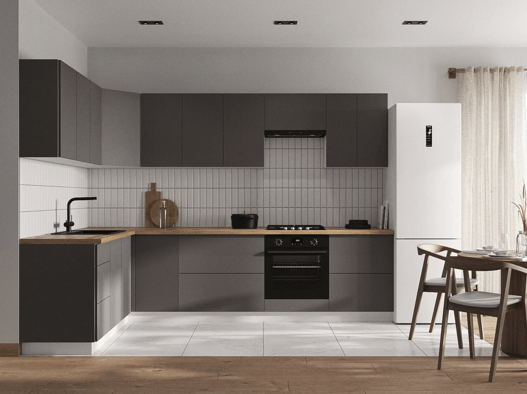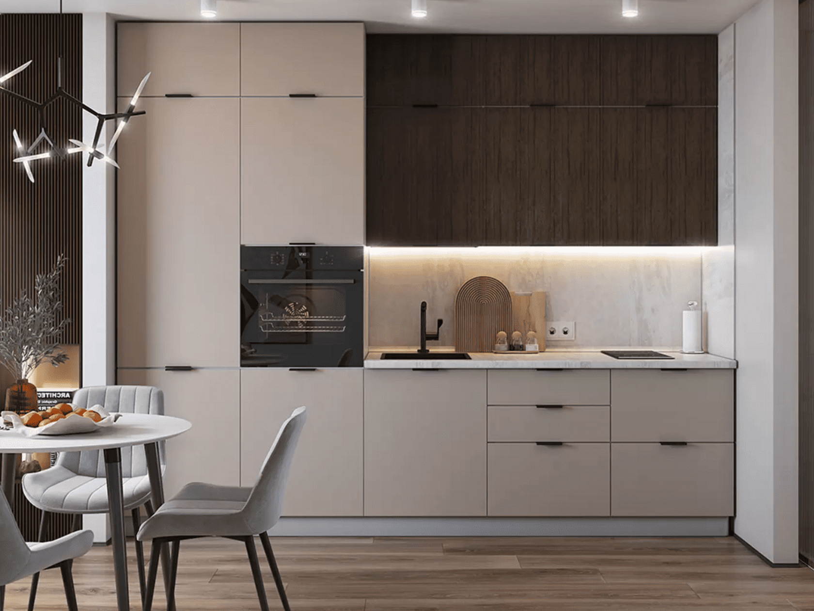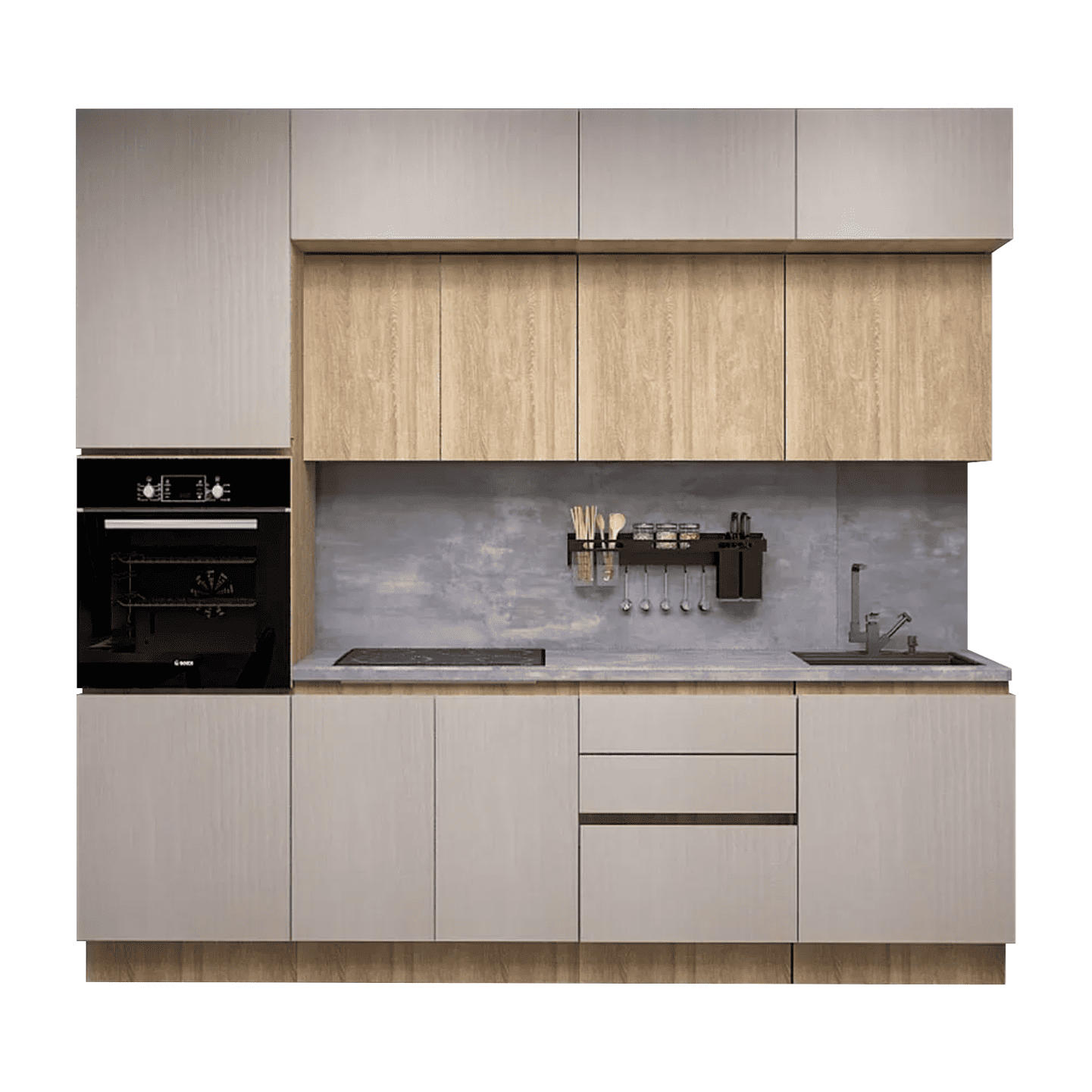 Кухонный гарнитур Triana — функциональное решение для ценителей современного минималистичного дизайна, которое позволит эффективно организовать пространство для хранения посуды и хозяйственных принадлежностей. Благодаря петлям с доводчиками и шариковым направляющим, дверцы и ящики двигаются плавно и бесшумно. Отсутствие внешней фурнитуры создает эффект монолитности, придавая гарнитуру стильный внешний вид. Антресольные шкафы открываются нажатием, а также оснащены газлифтами, что позволит избежать хлопков и резкого закрывания