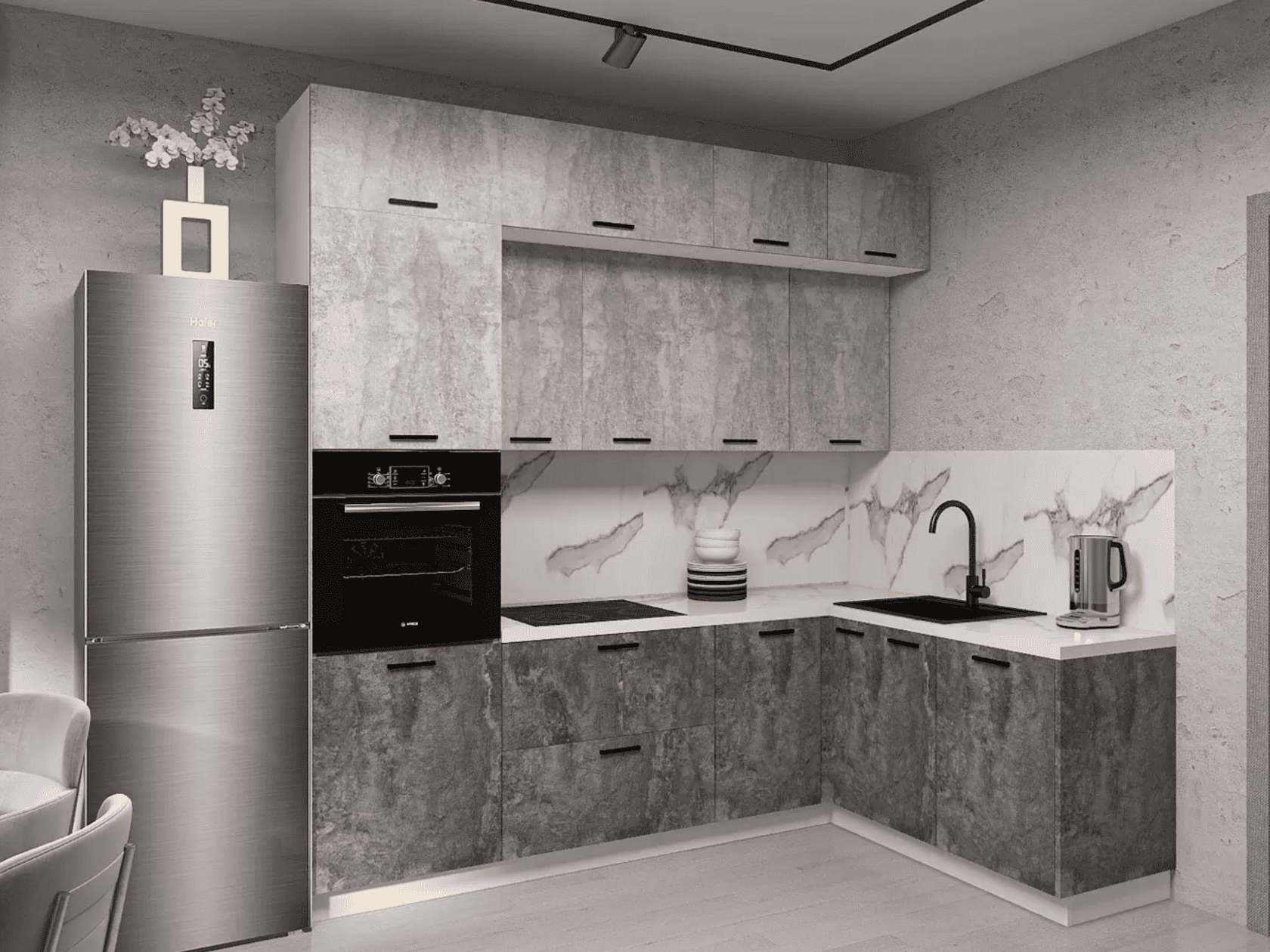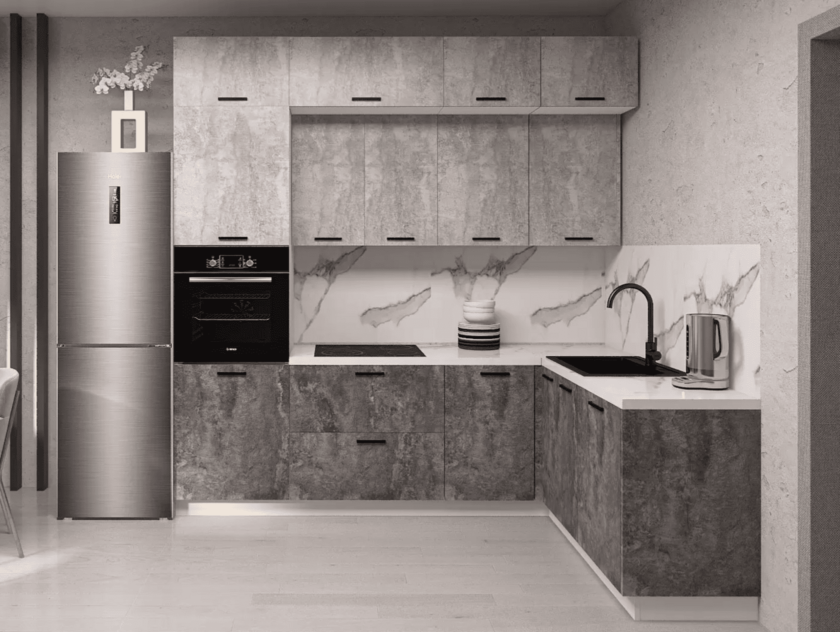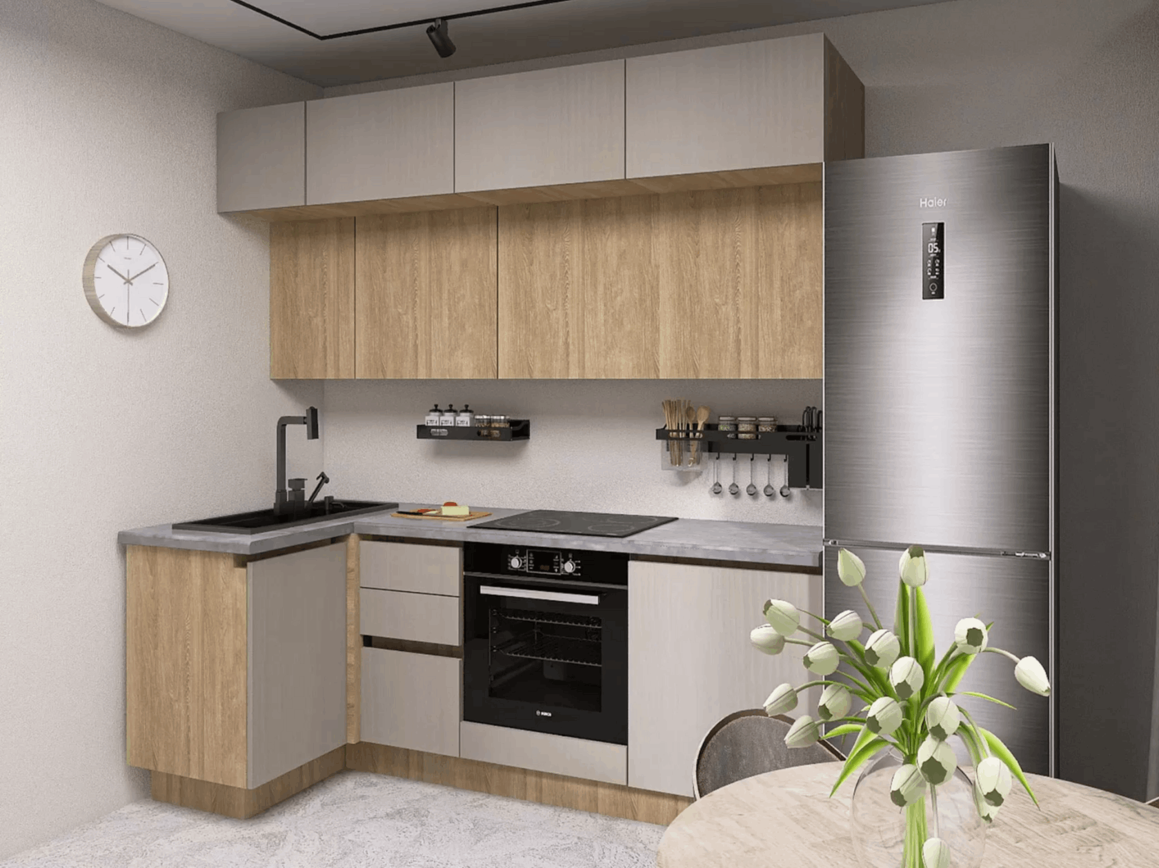 Кухонный гарнитур Martina 210×100 см поможет создать комфортную атмосферу для ежедневных хлопот. Элементы расположены по правилу рабочего треугольника. Готовить здесь очень удобно, так как всё необходимое находится под рукой. Матовые фасады с лаконичными ручками смотрятся привлекательно в любом современном интерьере