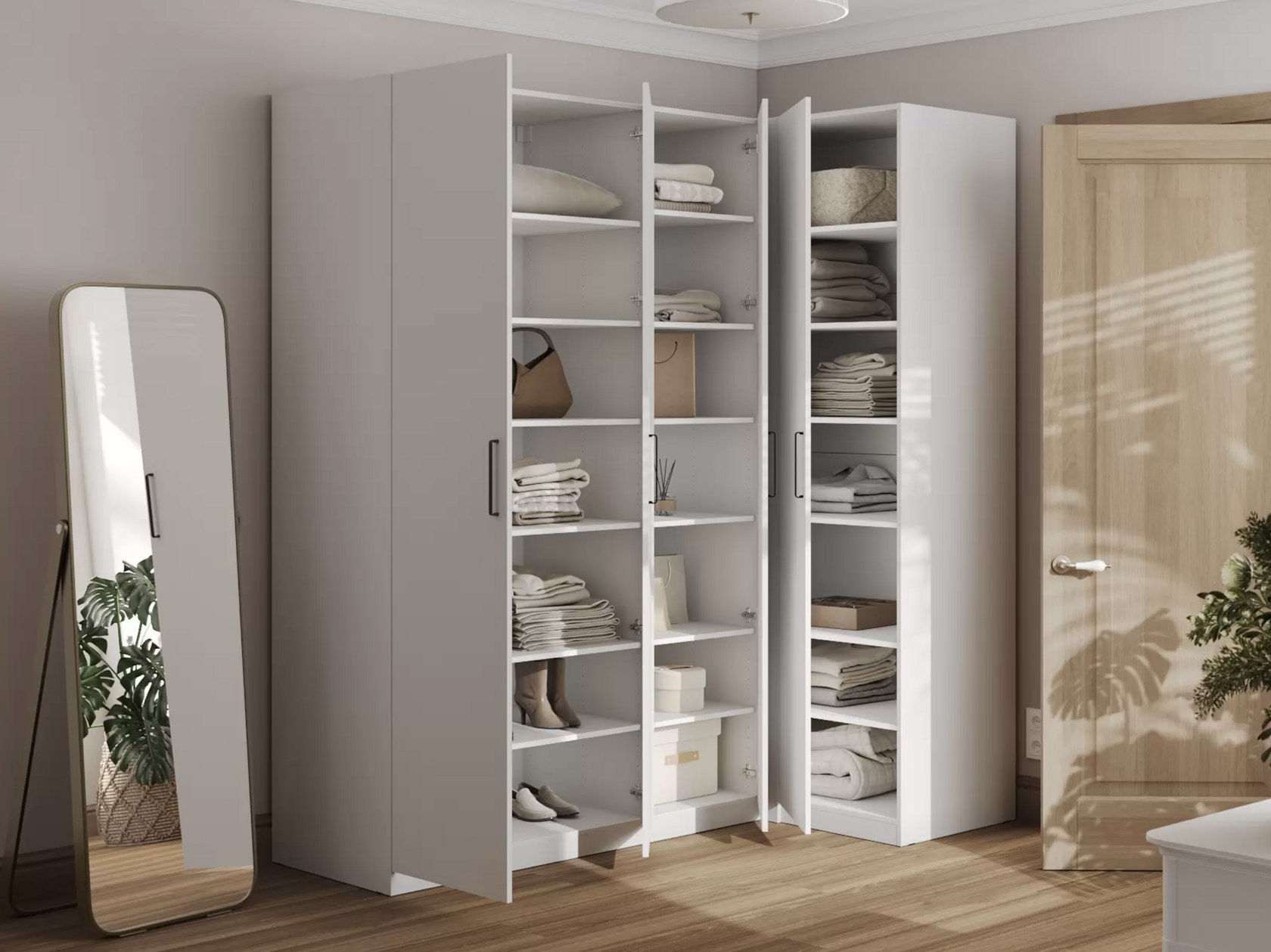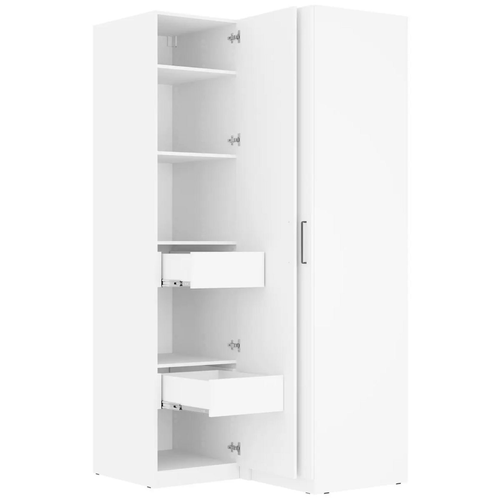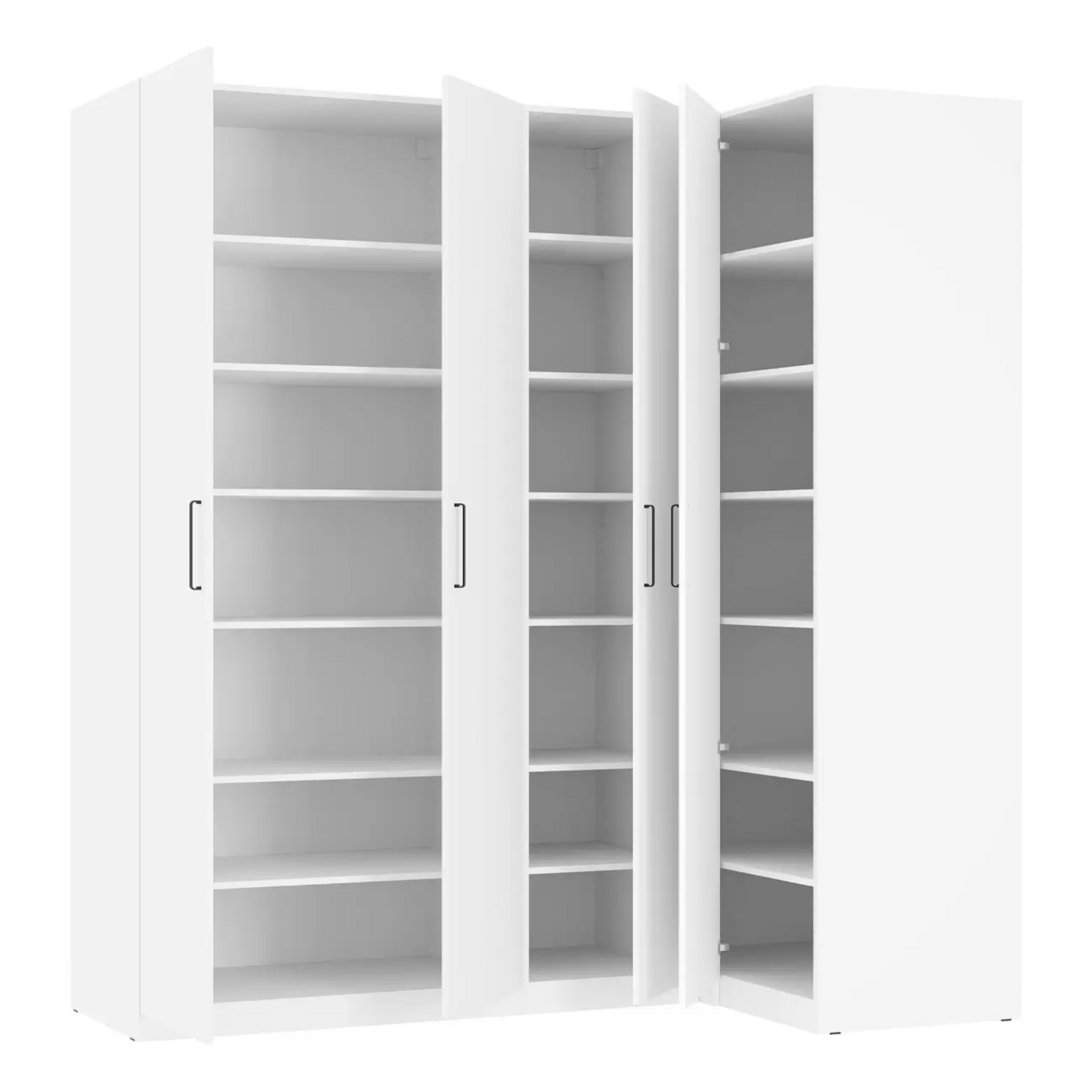 Угловой шкаф Katya — вместительный вариант, который идеально подойдет для обустройства гардеробной, кладовой или балкона. Множество полок позволят разместить все необходимые вещи. Угловая конструкция позволяет использовать пространство максимально эффективно