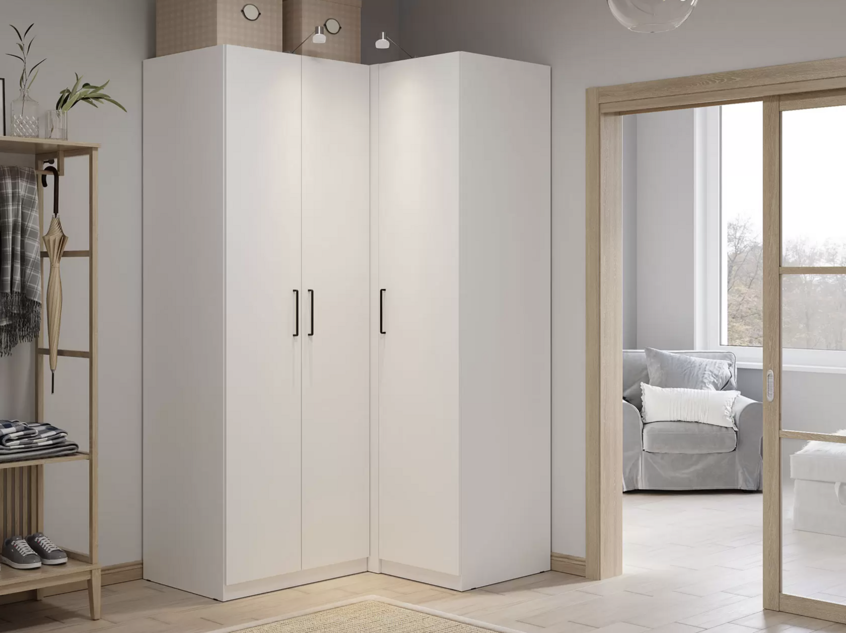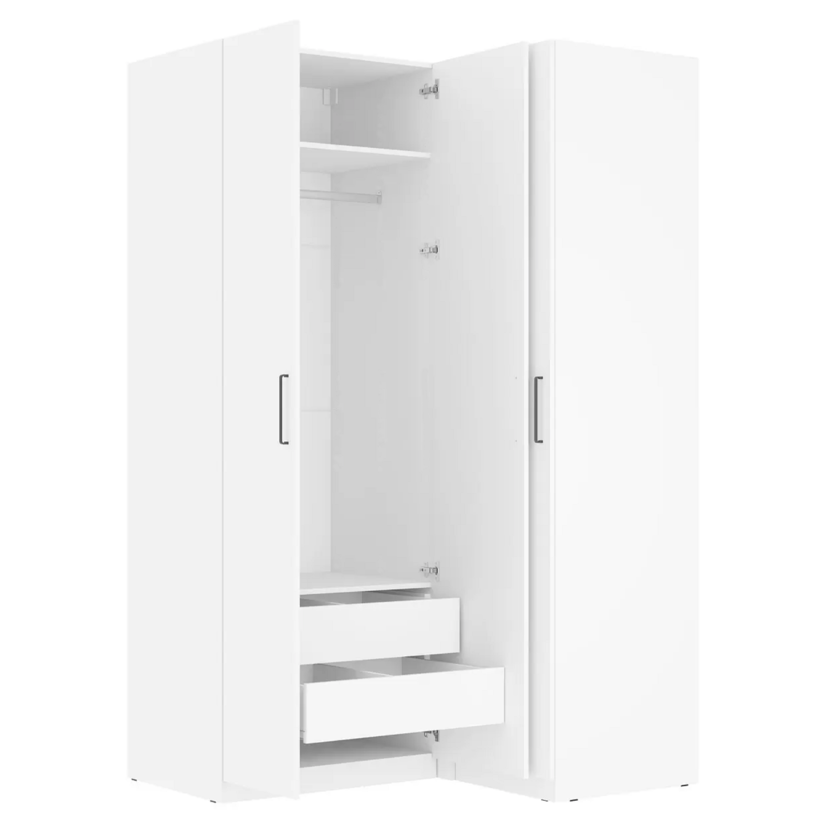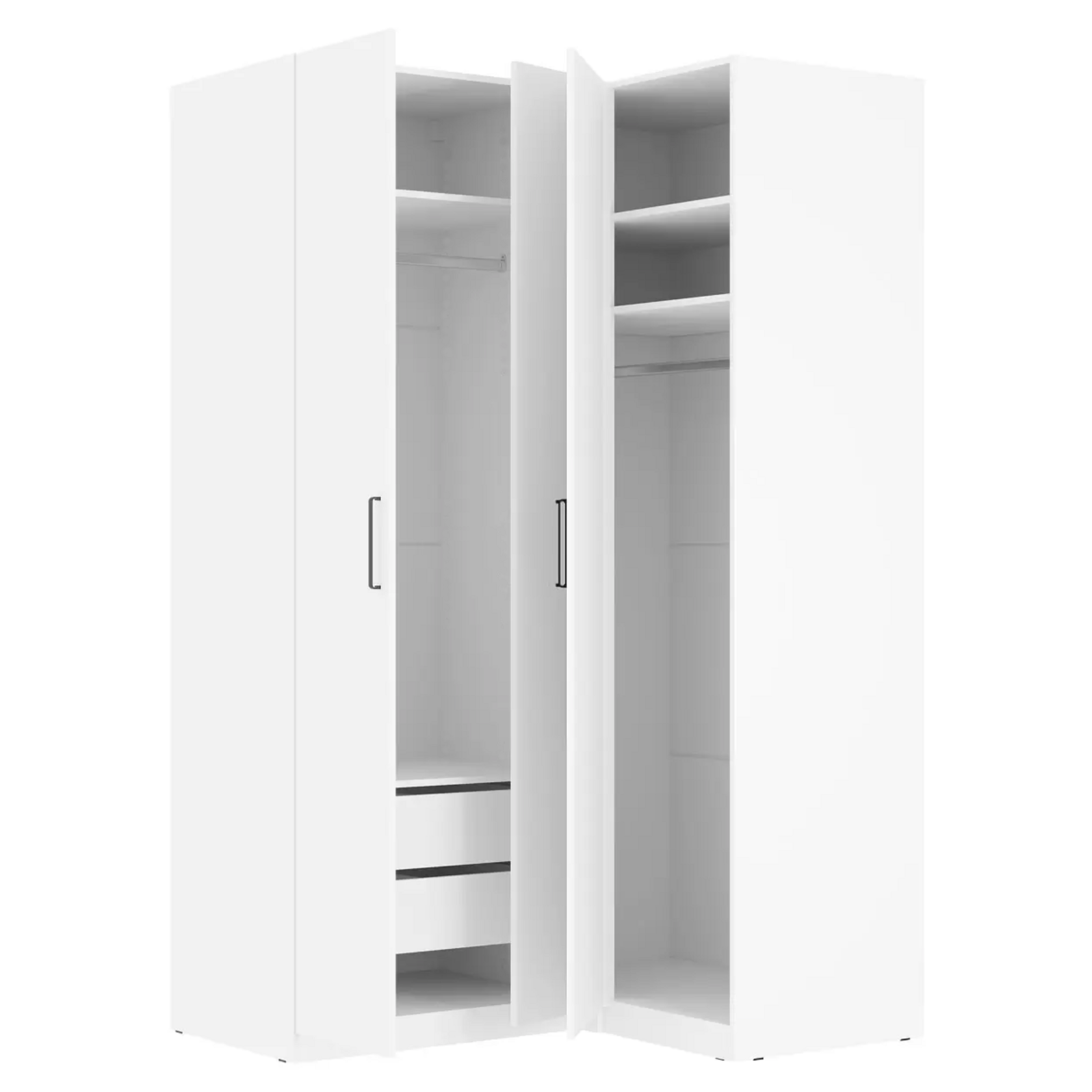 Угловой шкаф Elena — вместительная модель в стиле минимализм. Внутри удобно хранить любые вещи: от верхней одежды до сезонного текстиля и аксессуаров. Угловая конструкция позволяет использовать пространство максимально эффективно