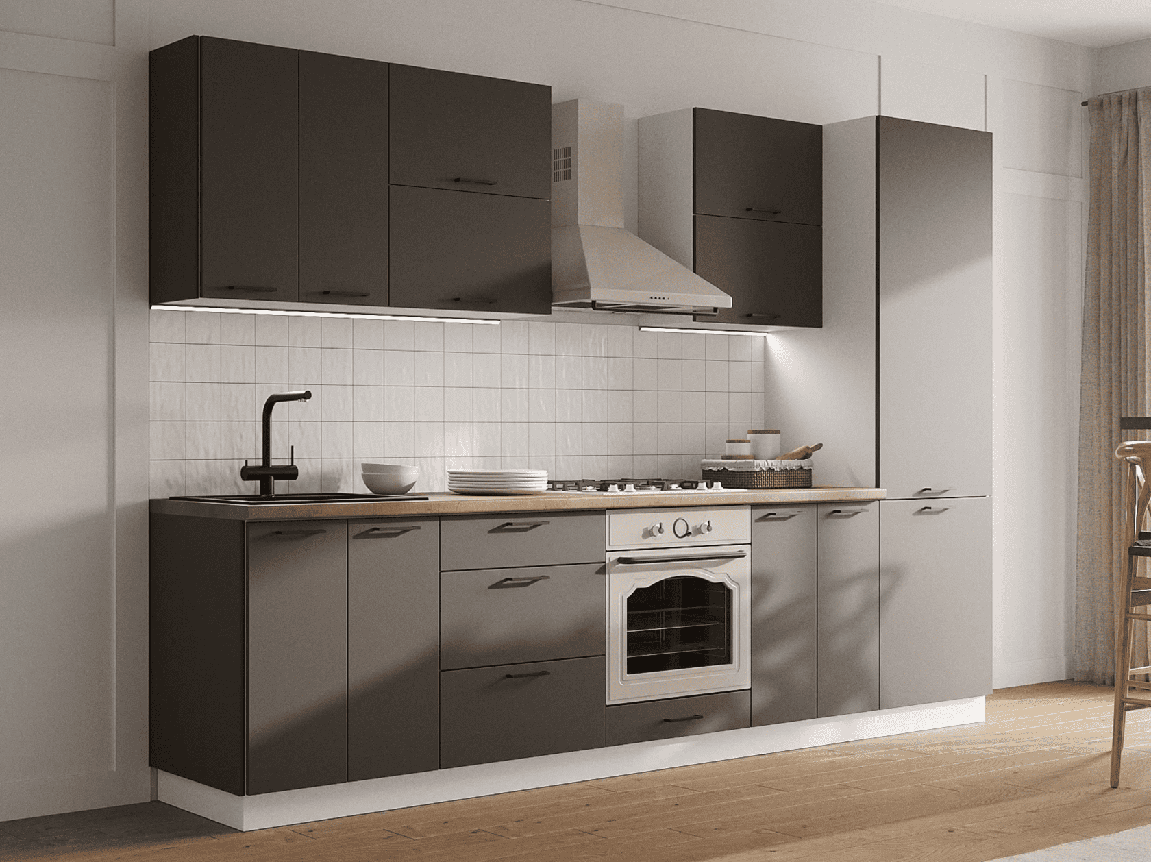Кухонный гарнитур Paula подойдет для создания комфортного пространства. Прямая конструкция позволяет расположить мебель вдоль одной стены и обеспечивает достаточно места для хранения и готовки. Сочетание разных текстур в оформлении фасадов и минималистичная фурнитура изящно дополняют интерьер