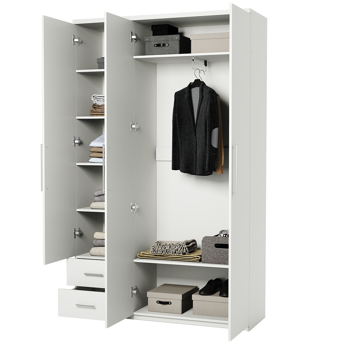 Вместительный шкаф Sabrina с распашными дверями — это идеальное решение для хранения одежды. Его главное достоинство — большой размер и два выдвижных ящика. В шкафу найдется место для всего: от платьев до курток, от нижнего белья до обуви. Широкие отделения помогут разделить одежду по категориям и поддерживать порядок. Распашные двери легко открываются, а выдвижные ящики ускоряют поиск нужных вещей