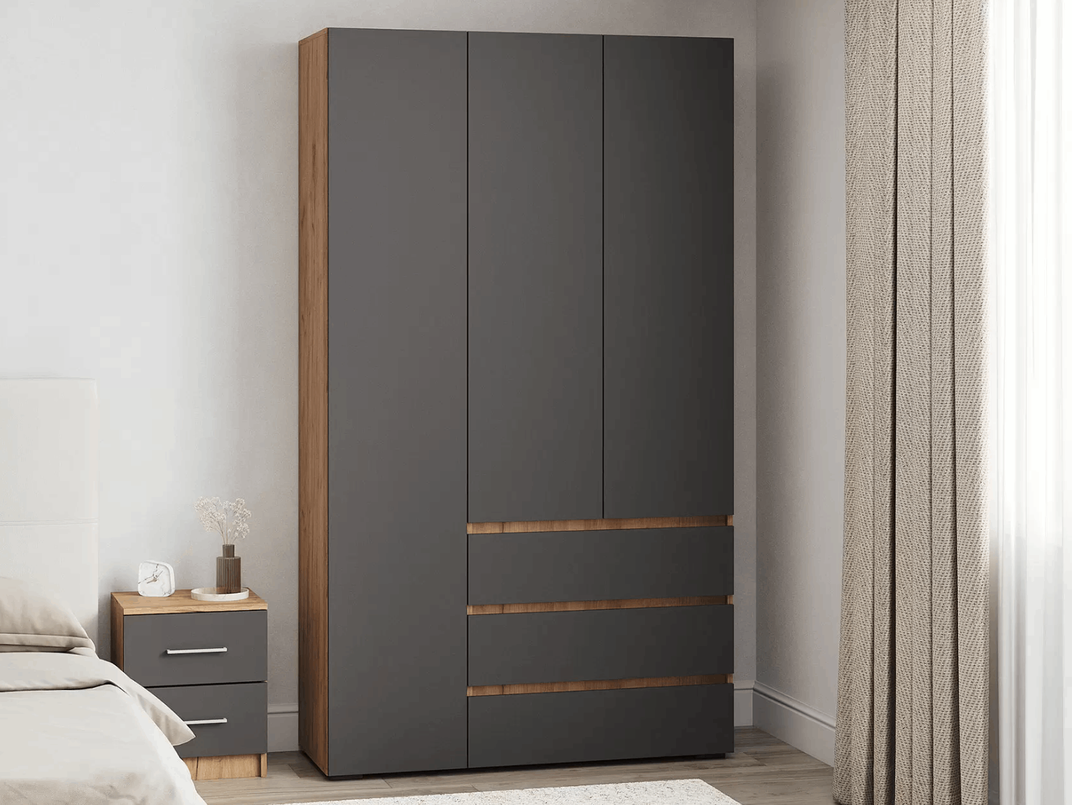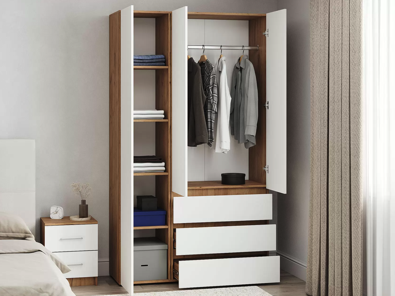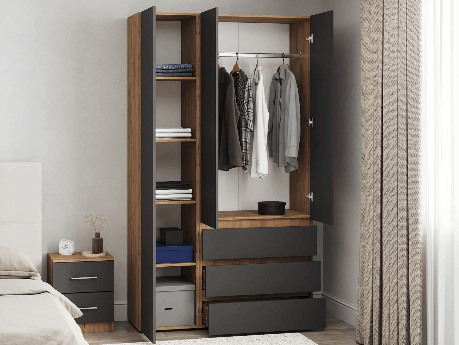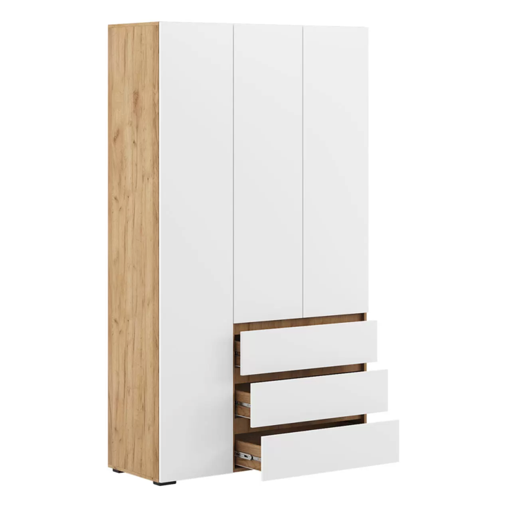 Вместительный шкаф «Loki» с распашными дверями — это идеальное решение для хранения одежды. Его главное достоинство — большой размер и два выдвижных ящика. В шкафу найдется место для всего: от платьев до курток, от нижнего белья до обуви. Широкие отделения помогут разделить одежду по категориям и поддерживать порядок. Распашные двери легко открываются, а выдвижные ящики ускоряют поиск нужных вещей