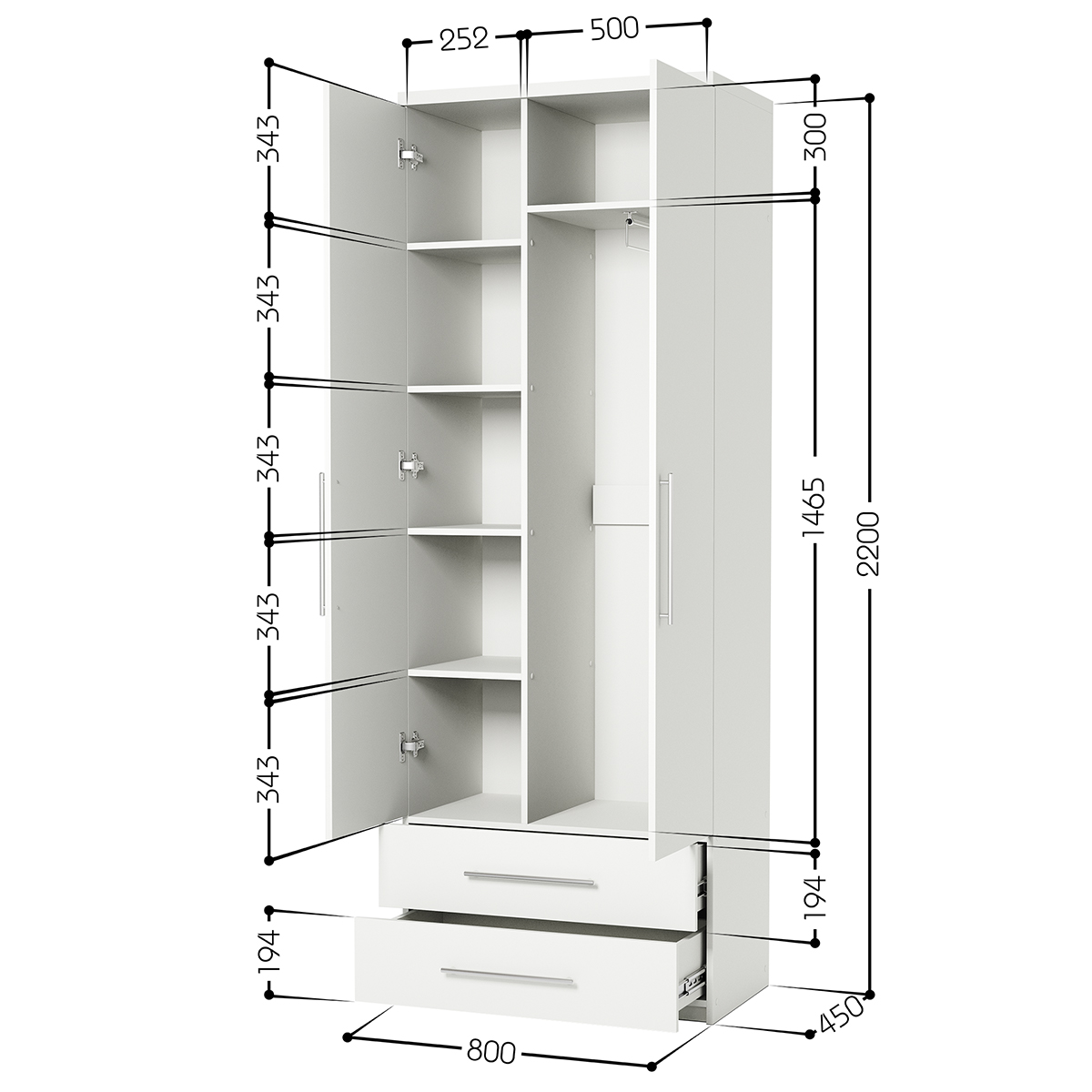 - Габариты (Ш×В×Г): 80 × 220 × 45 см - Материал: ЛДСП Kronospan 16 мм - Особенности: Петли из нержавеющей стали Boyard