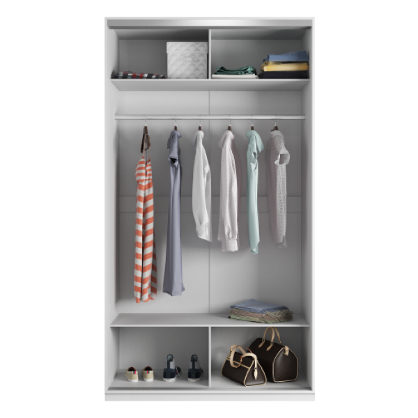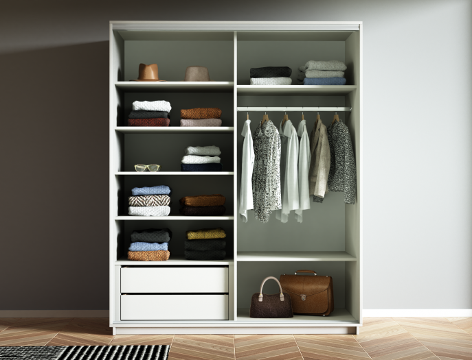 Шкаф Stella можно установить в любой комнате квартиры или офиса. Наполнение шкафа состоит из полок для хранения вещей в сложенном виде, одной штанги для вешалок из хромированного металла и двух выдвижных ящиков, которые легко открываются, обеспечивая удобное хранение нужных вещей