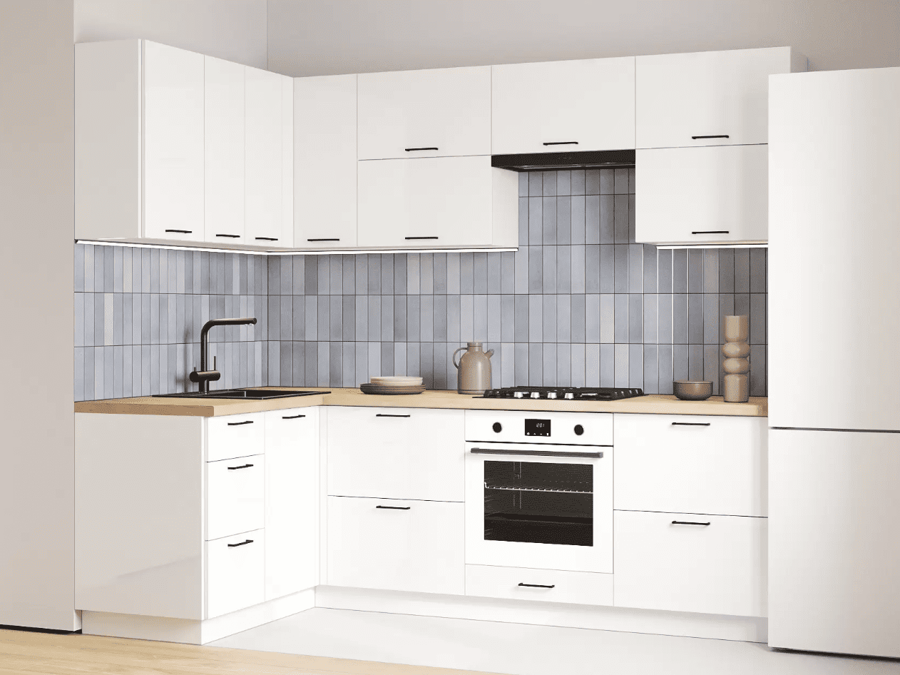 Кухонный гарнитур Abril обеспечит комфортное расположение рабочей зоны и поможет организовать продуманное хранение продуктов и утвари. Гладкие фасады дополнены лаконичными продолговатыми ручками. Такой дизайн легко адаптировать под разные стили интерьера. Материал устойчив к выгоранию, температурным перепадам и различным повреждениям
