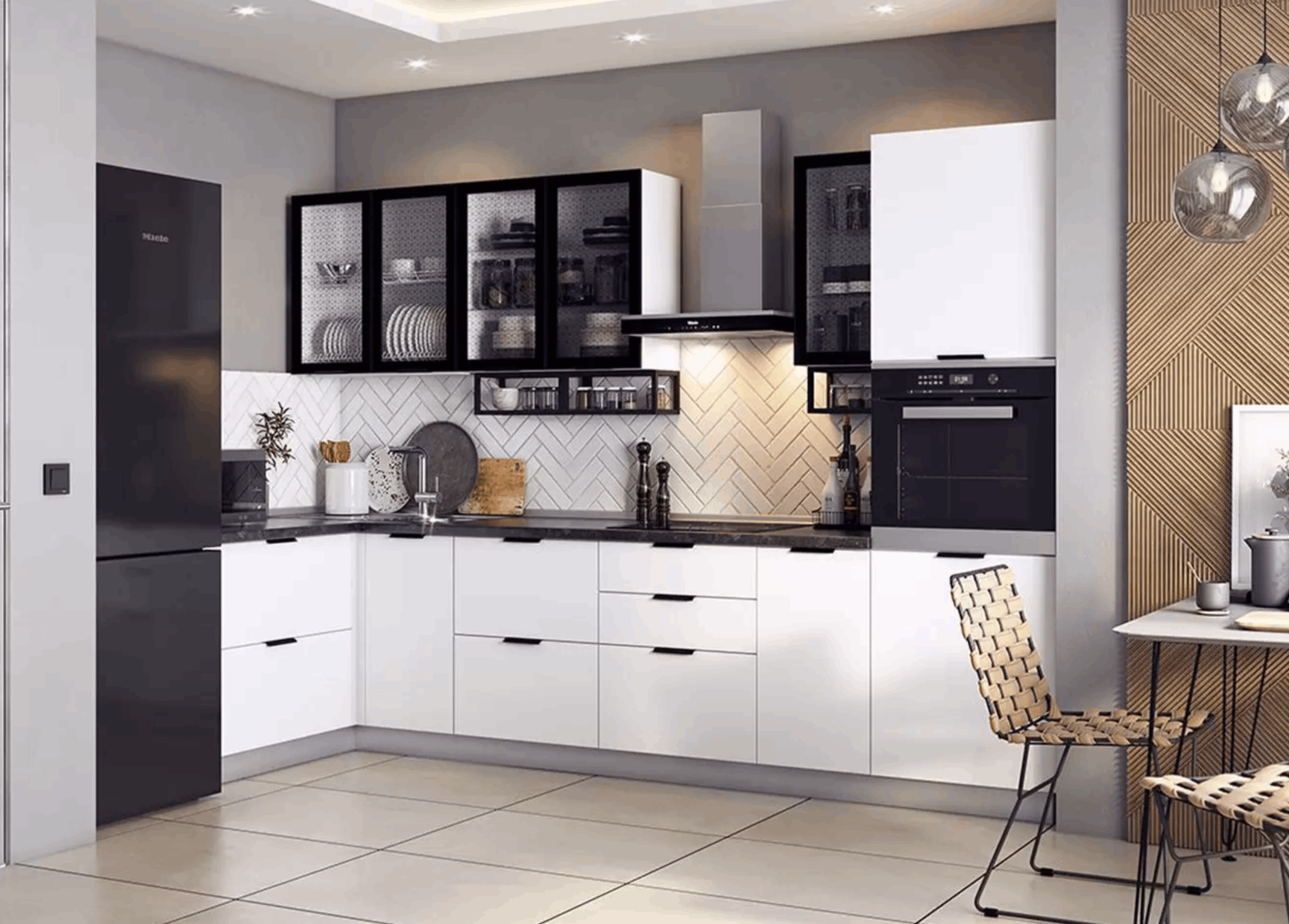 Кухонный гарнитур Monica 240×140 см — практичное приобретение на долгие годы. Расположение элементов позволяет оптимально использовать пространство и соблюсти правило рабочего треугольника. Благодаря множеству зон для хранения в помещении легко поддерживать порядок, расположив необходимую посуду и утварь под рукой.